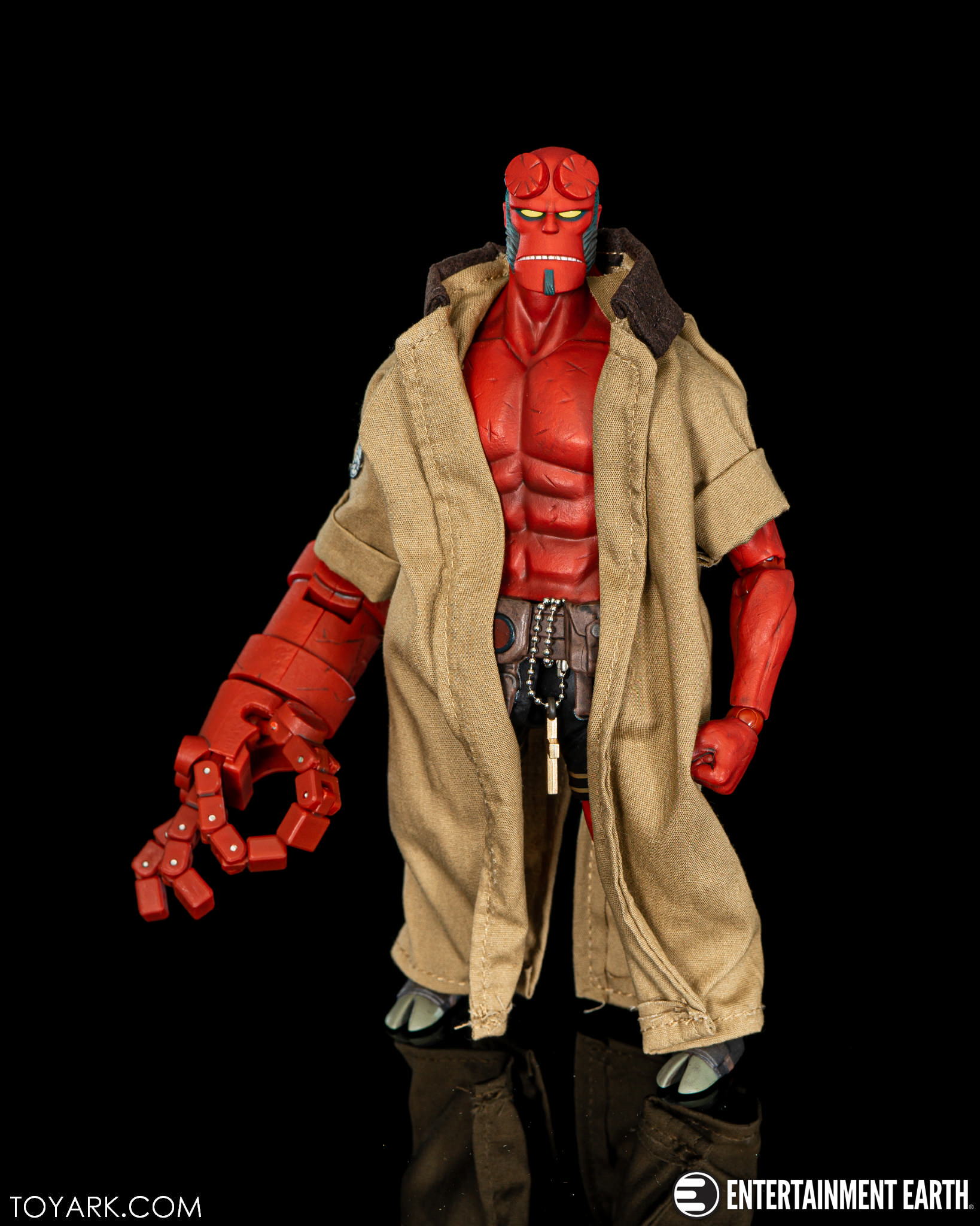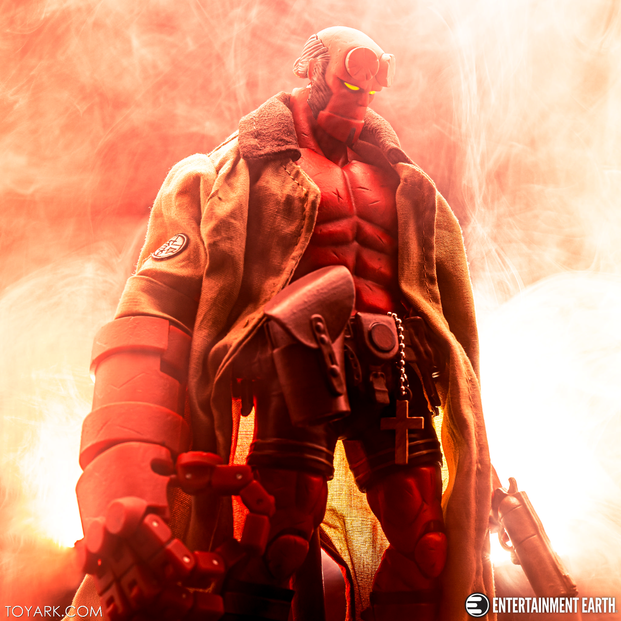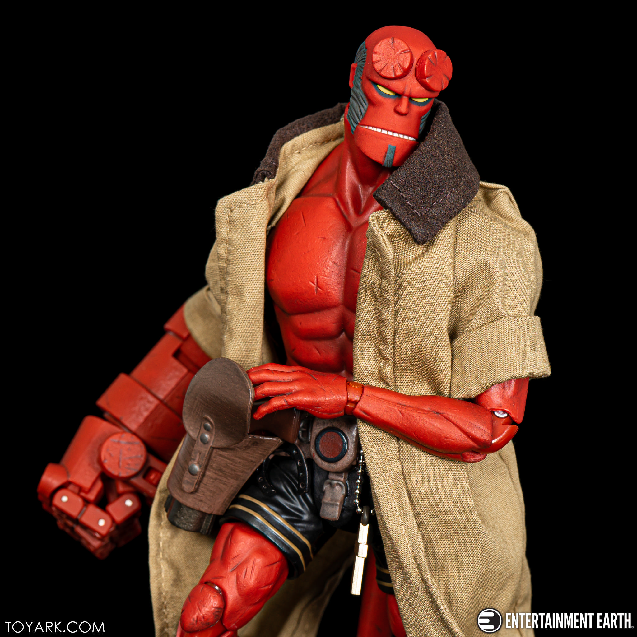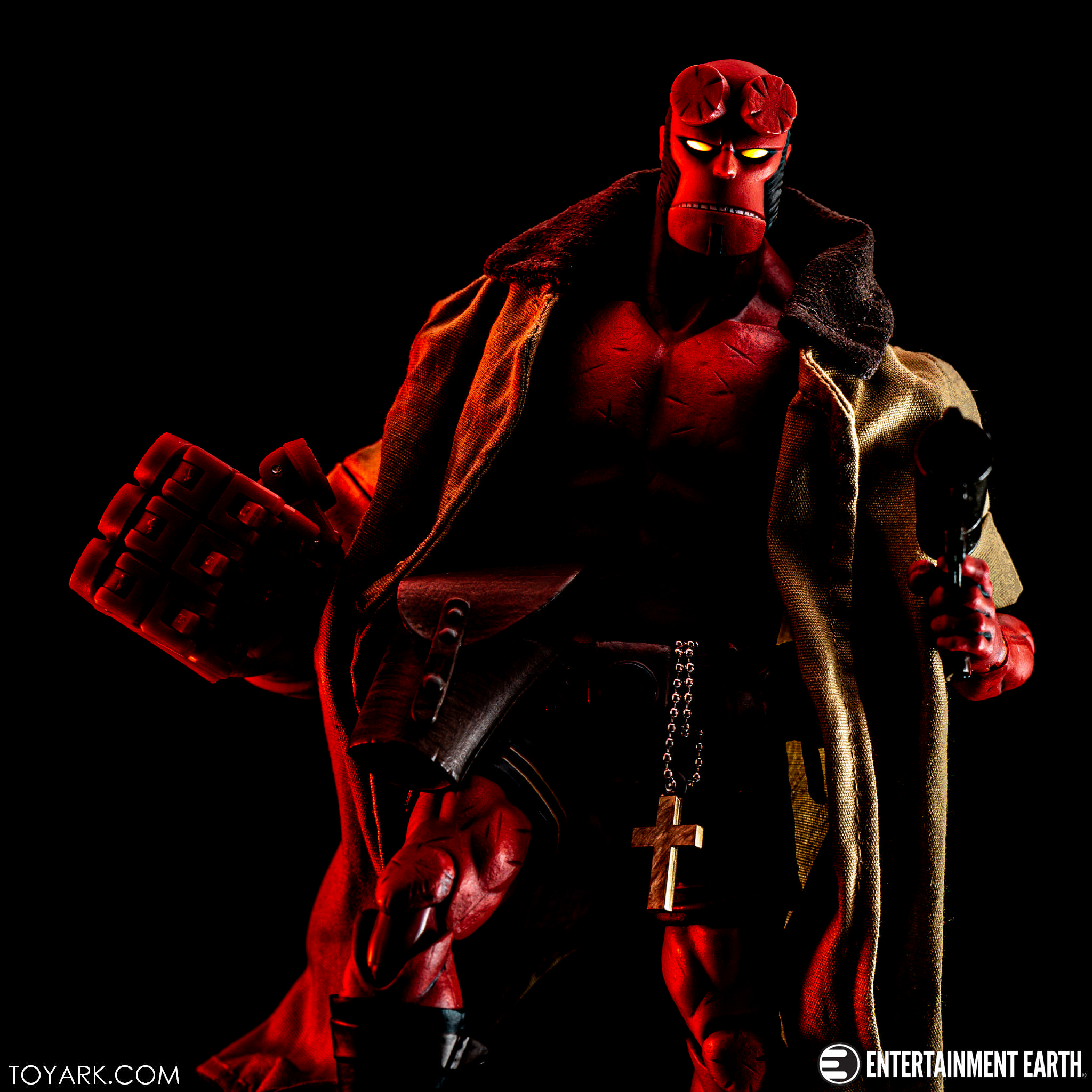 Tonight we are taking a look at the Darkhorse Comics 1000Toys Hellboy 1:12 scale figure. This has been on display at shows for the last year or so and I was immediately in. I am a casual Hellboy fan, random comics, movies and the like over the years, and this one off figure was a great way to rep him in my collection. 1000Toys is known for unique high end figures and they did not disappoint here. The figure has a skeleton based upper with a solid silicone-like torso layered on top that bends with all movement. Arms and legs are painted to match with exposed joints as needed. Even the Right Hand of Doom is articulated at the fingers and wrist, double jointed elbow. He comes packed with 2 heads, 4 left hands, soft-goods trench-coat, tail, gun and holster. Overall once in hand it’s even more impressive than it was on display. He scales great with Marvel Legends, S.H. Figuarts and the like so you can have him battle cross dimensionally no problem.