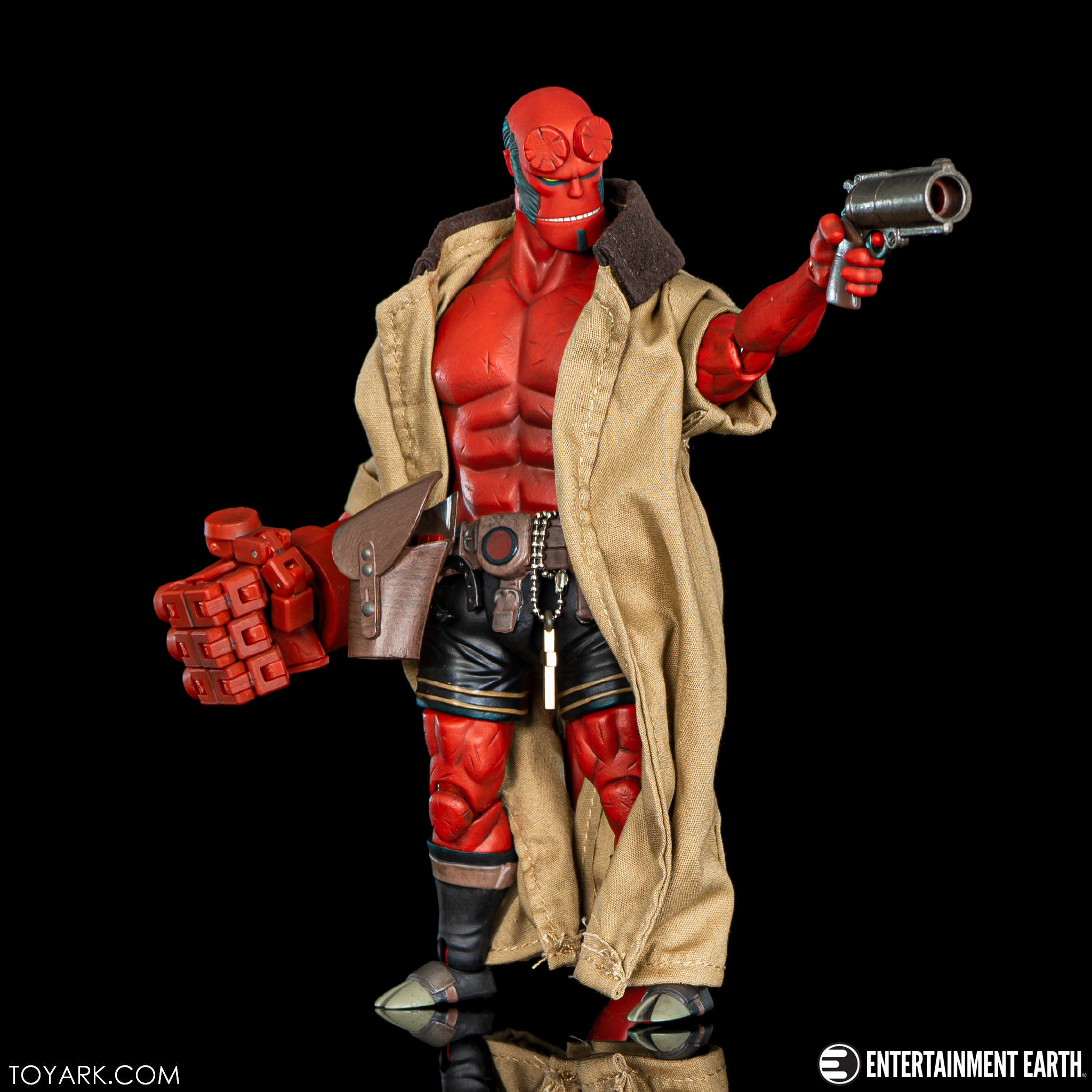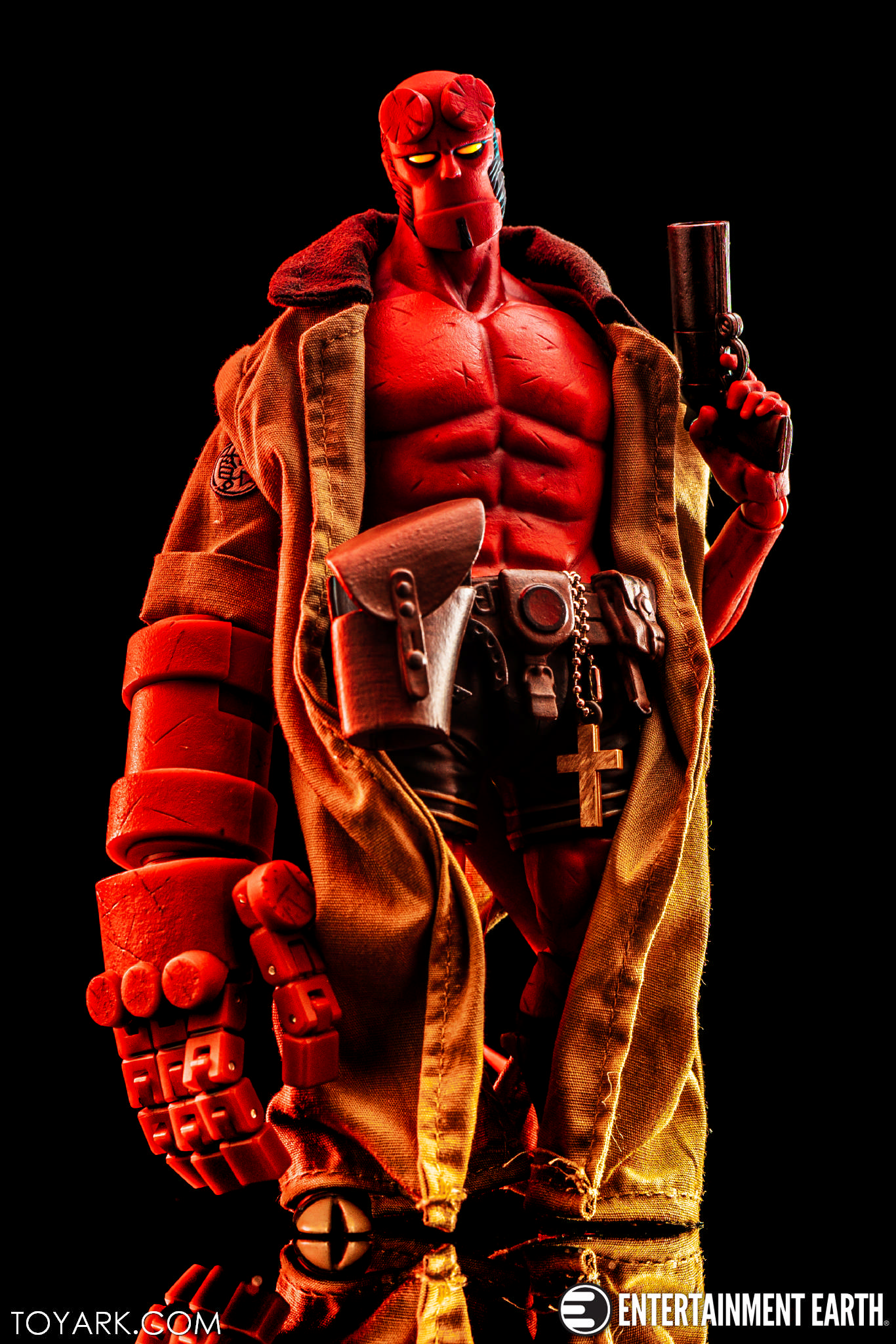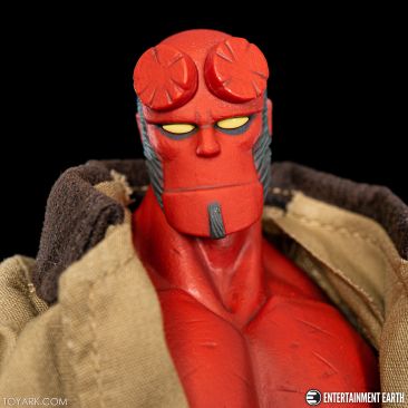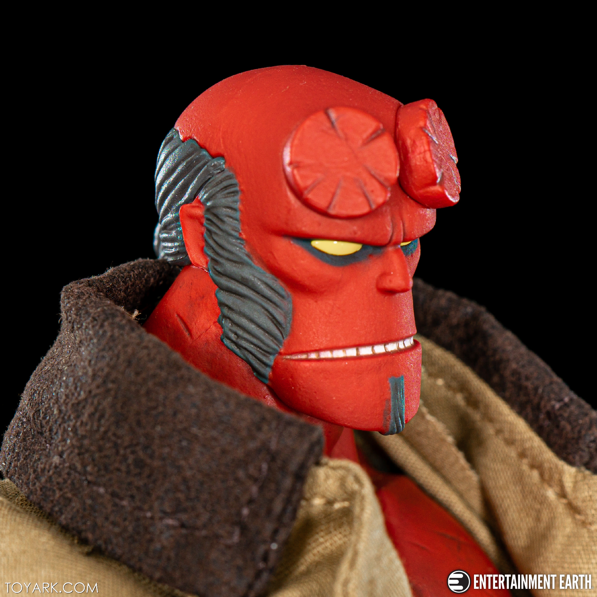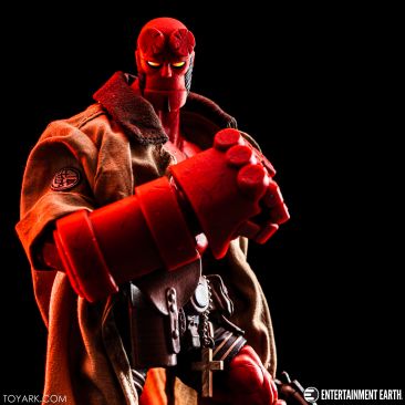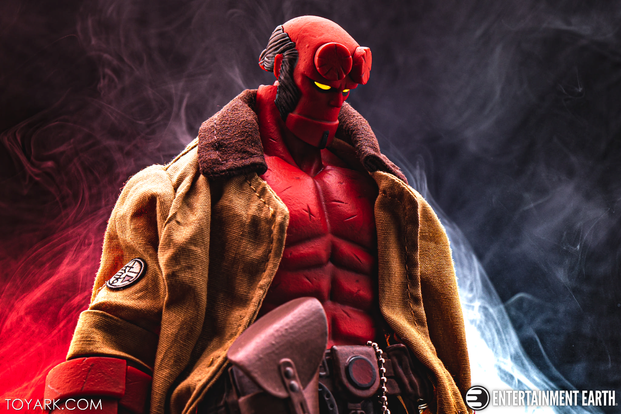 Tonight we are taking a look at the Darkhorse Comics 1000Toys Hellboy 1:12 scale figure. This has been on display at shows for the last year or so and I was immediately in. I am a casual Hellboy fan, random comics, movies and the like over the years, and this one off figure was a great way to rep him in my collection. 1000Toys is known for unique high end figures and they did not disappoint here. The figure has a skeleton based upper with a solid silicone-like torso layered on top that bends with all movement. Arms and legs are painted to match with exposed joints as needed. Even the Right Hand of Doom is articulated at the fingers and wrist, double jointed elbow. He comes packed with 2 heads, 4 left hands, soft-goods trench-coat, tail, gun and holster. Overall once in hand it’s even more impressive than it was on display. He scales great with Marvel Legends, S.H. Figuarts and the like so you can have him battle cross dimensionally no problem.