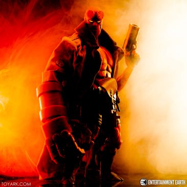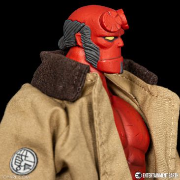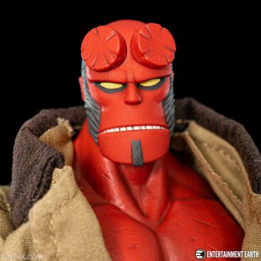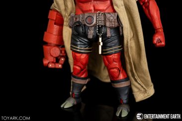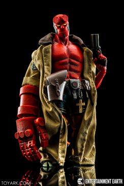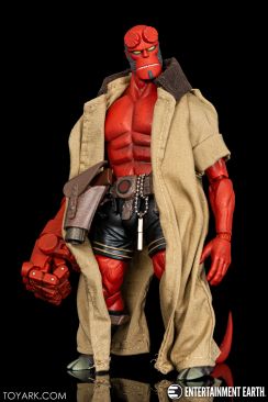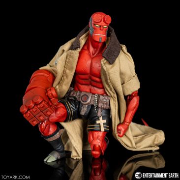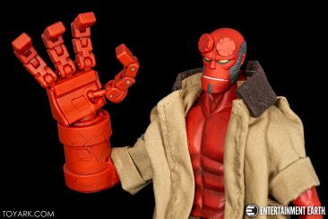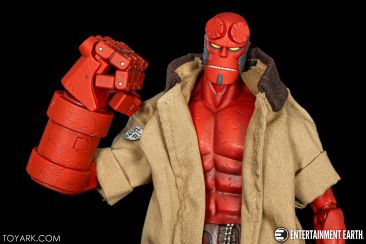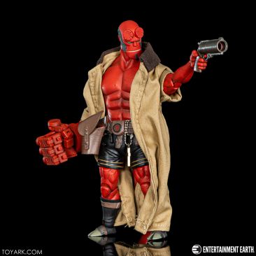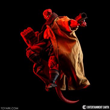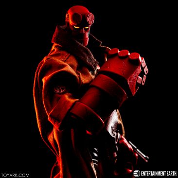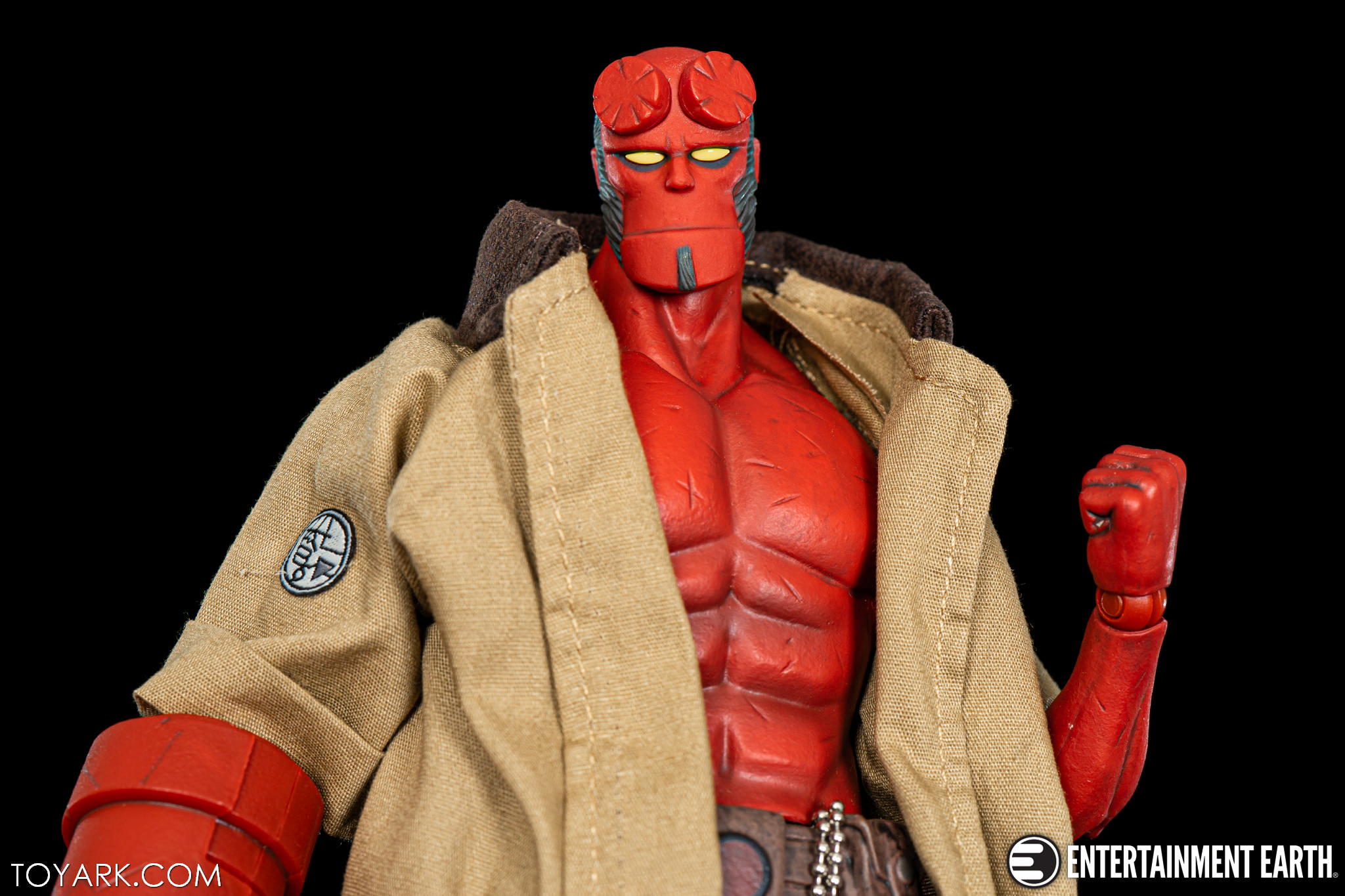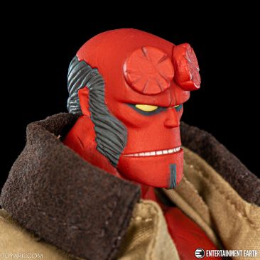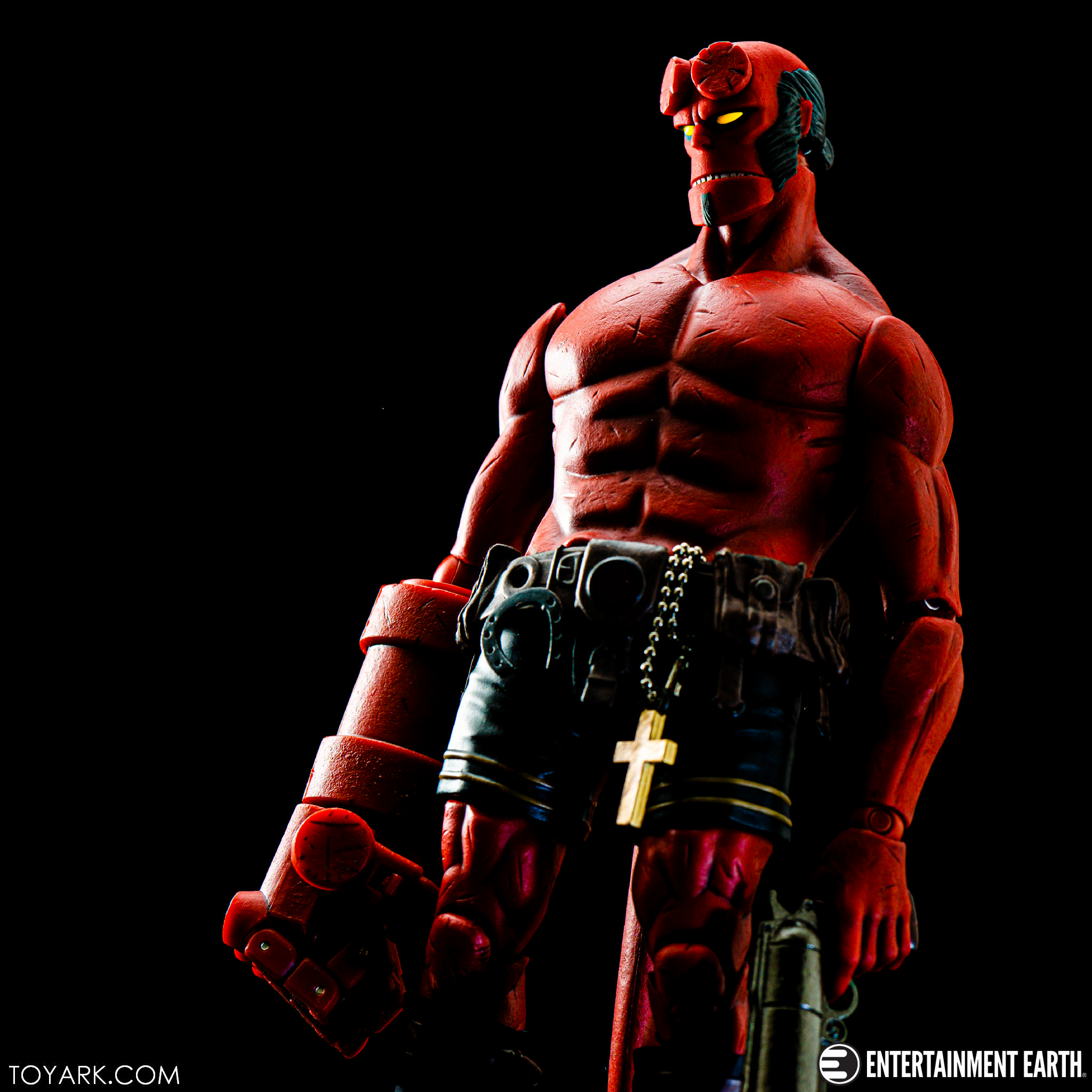Tonight we are taking a look at the Darkhorse Comics 1000Toys Hellboy 1:12 scale figure. This has been on display at shows for the last year or so and I was immediately in. I am a casual Hellboy fan, random comics, movies and the like over the years, and this one off figure was a great way to rep him in my collection. 1000Toys is known for unique high end figures and they did not disappoint here. The figure has a skeleton based upper with a solid silicone-like torso layered on top that bends with all movement. Arms and legs are painted to match with exposed joints as needed. Even the Right Hand of Doom is articulated at the fingers and wrist, double jointed elbow. He comes packed with 2 heads, 4 left hands, soft-goods trench-coat, tail, gun and holster. Overall once in hand it’s even more impressive than it was on display. He scales great with Marvel Legends, S.H. Figuarts and the like so you can have him battle cross dimensionally no problem.