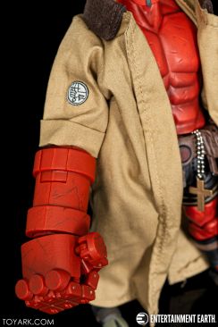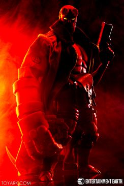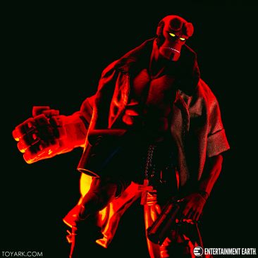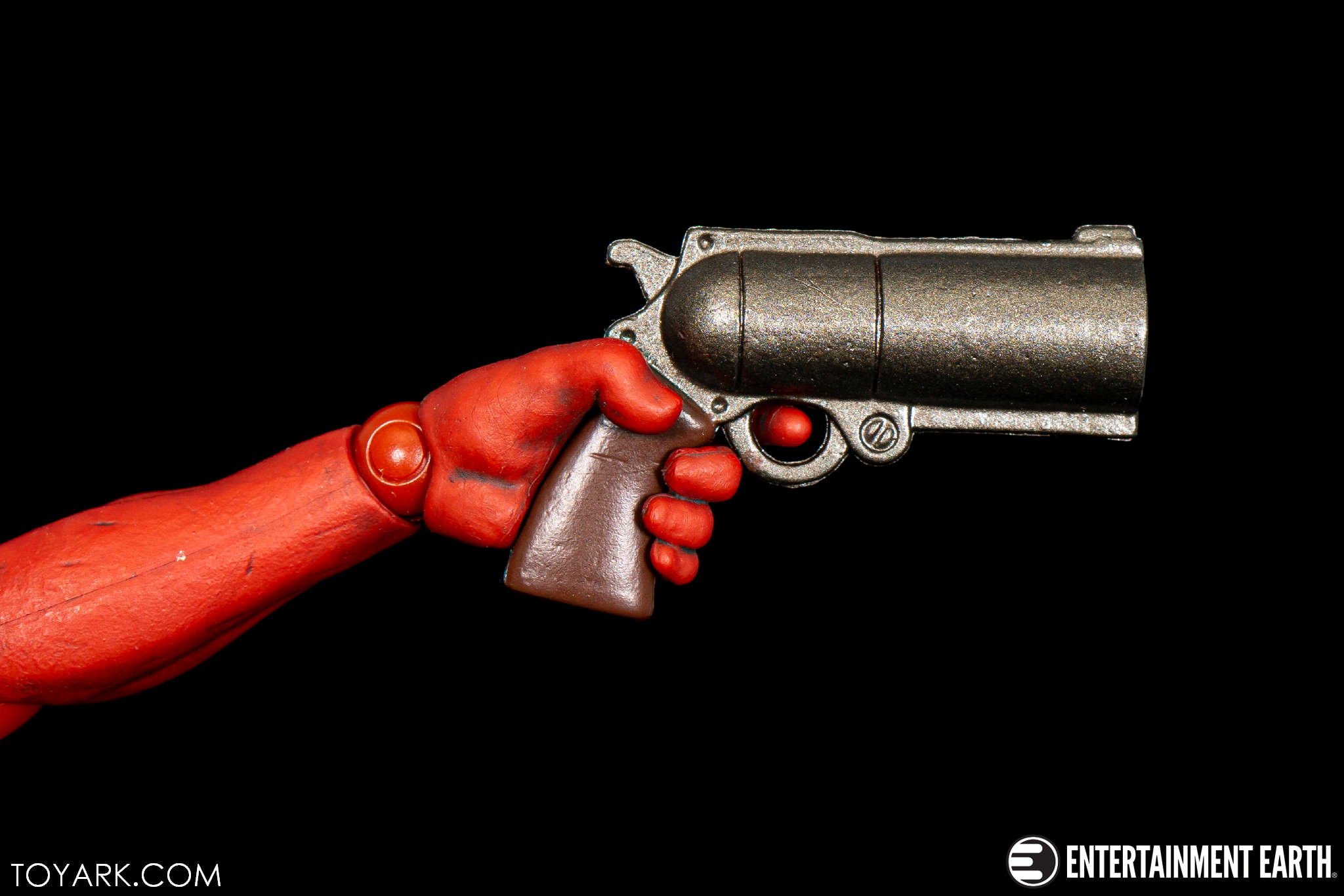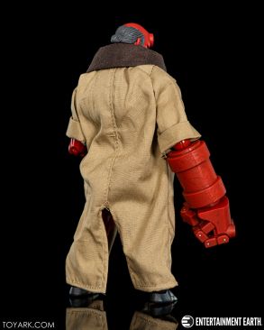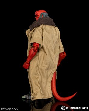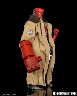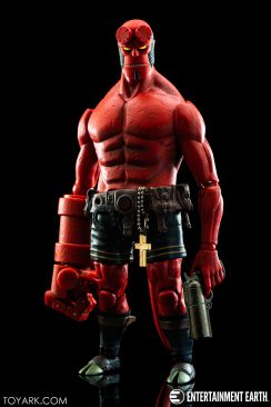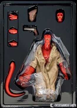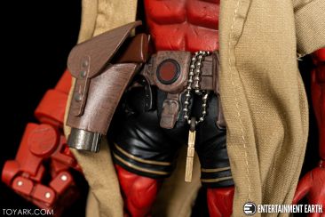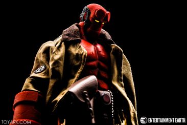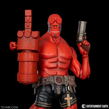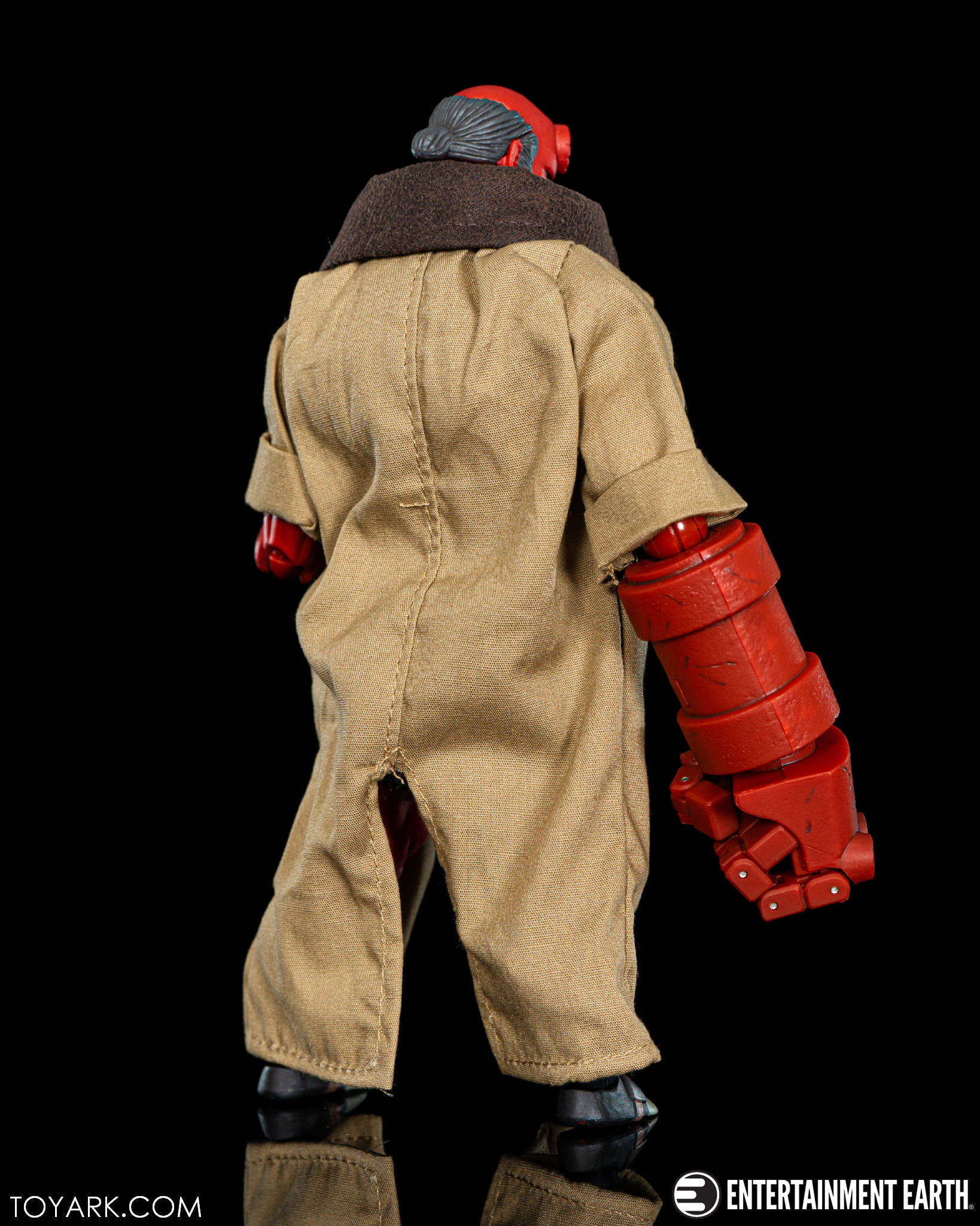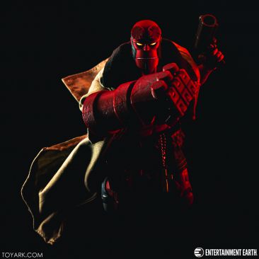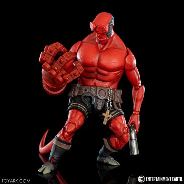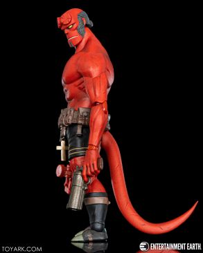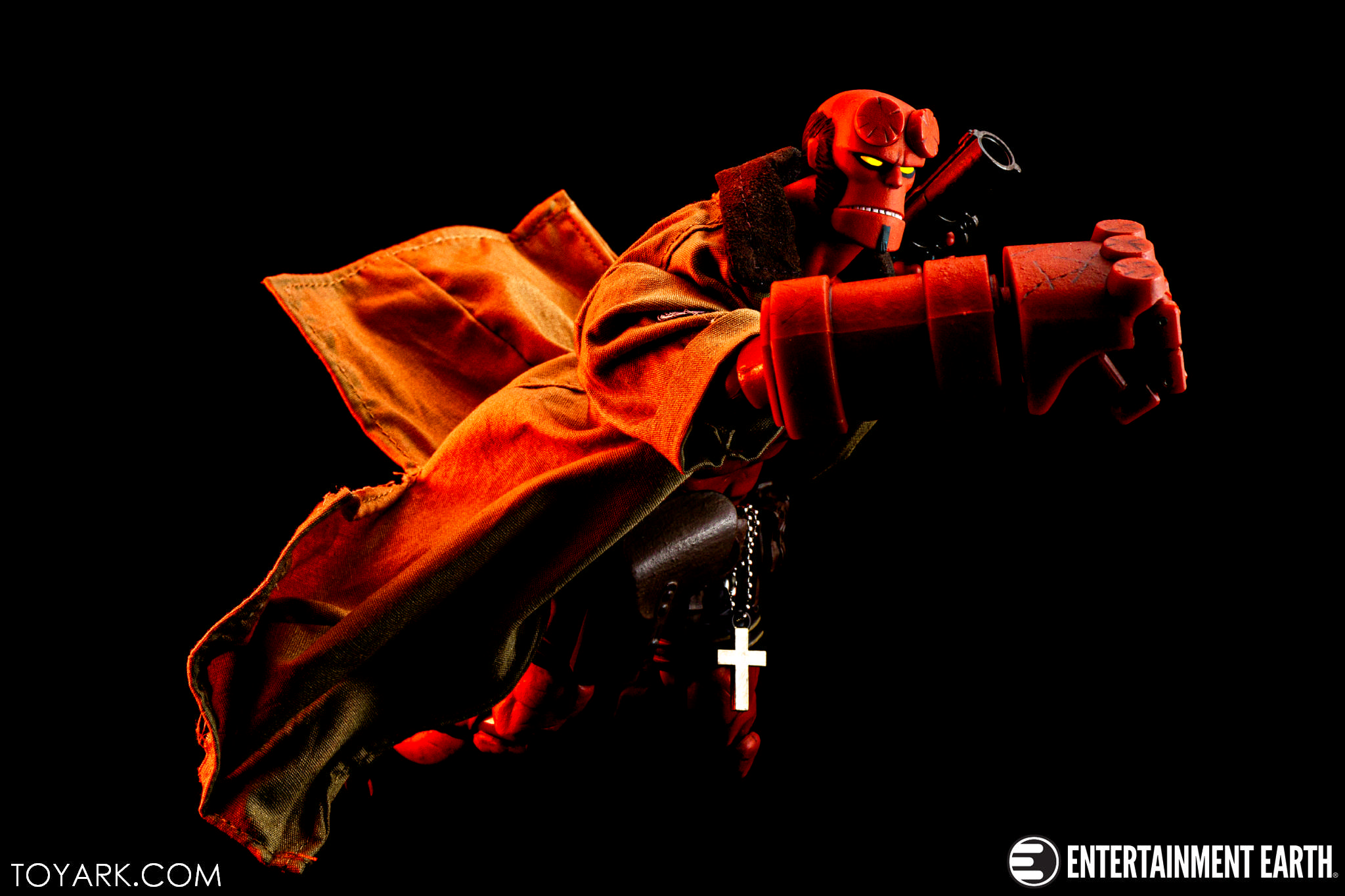 Tonight we are taking a look at the Darkhorse Comics 1000Toys Hellboy 1:12 scale figure. This has been on display at shows for the last year or so and I was immediately in. I am a casual Hellboy fan, random comics, movies and the like over the years, and this one off figure was a great way to rep him in my collection. 1000Toys is known for unique high end figures and they did not disappoint here. The figure has a skeleton based upper with a solid silicone-like torso layered on top that bends with all movement. Arms and legs are painted to match with exposed joints as needed. Even the Right Hand of Doom is articulated at the fingers and wrist, double jointed elbow. He comes packed with 2 heads, 4 left hands, soft-goods trench-coat, tail, gun and holster. Overall once in hand it’s even more impressive than it was on display. He scales great with Marvel Legends, S.H. Figuarts and the like so you can have him battle cross dimensionally no problem.
