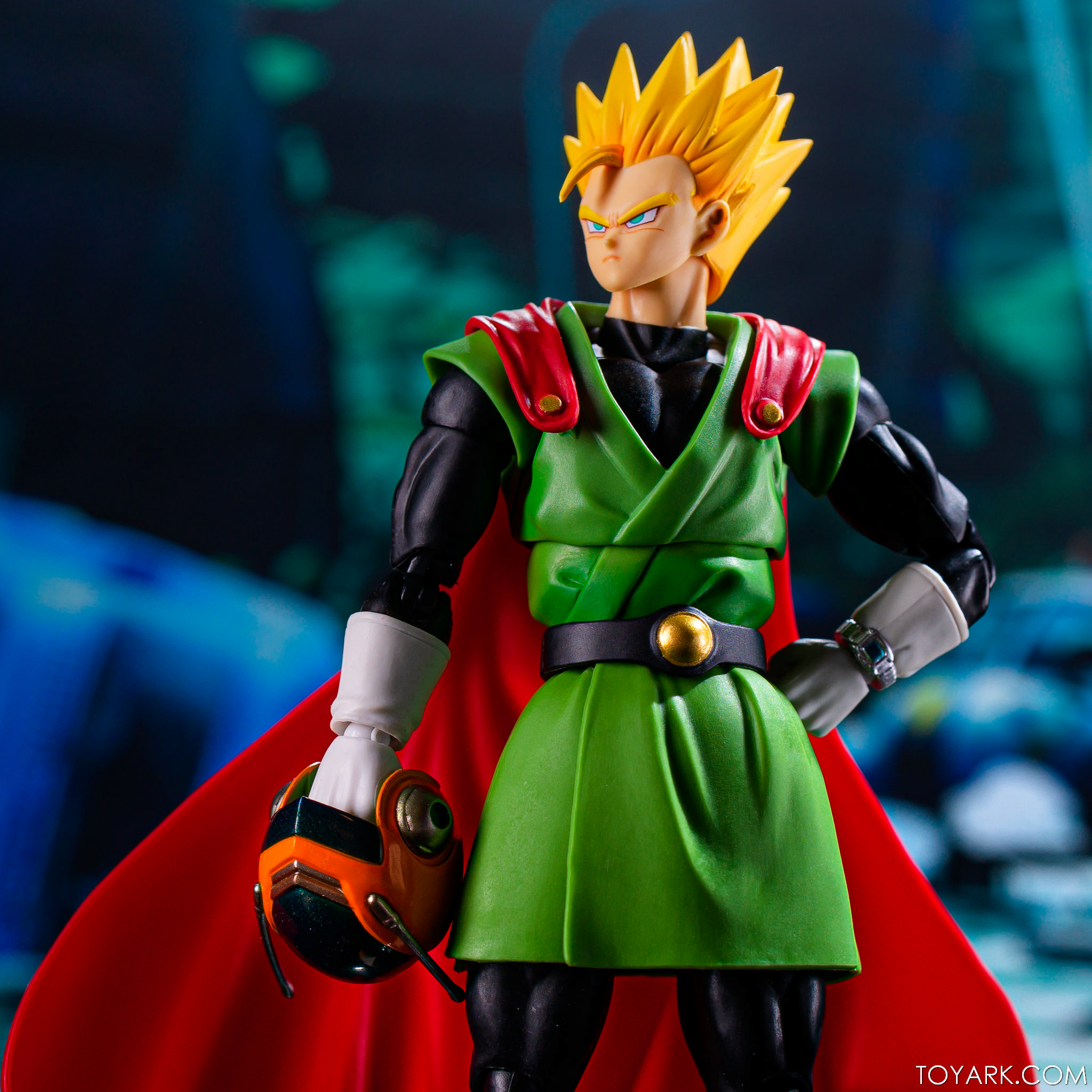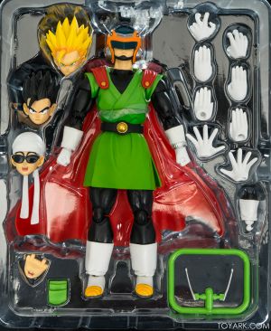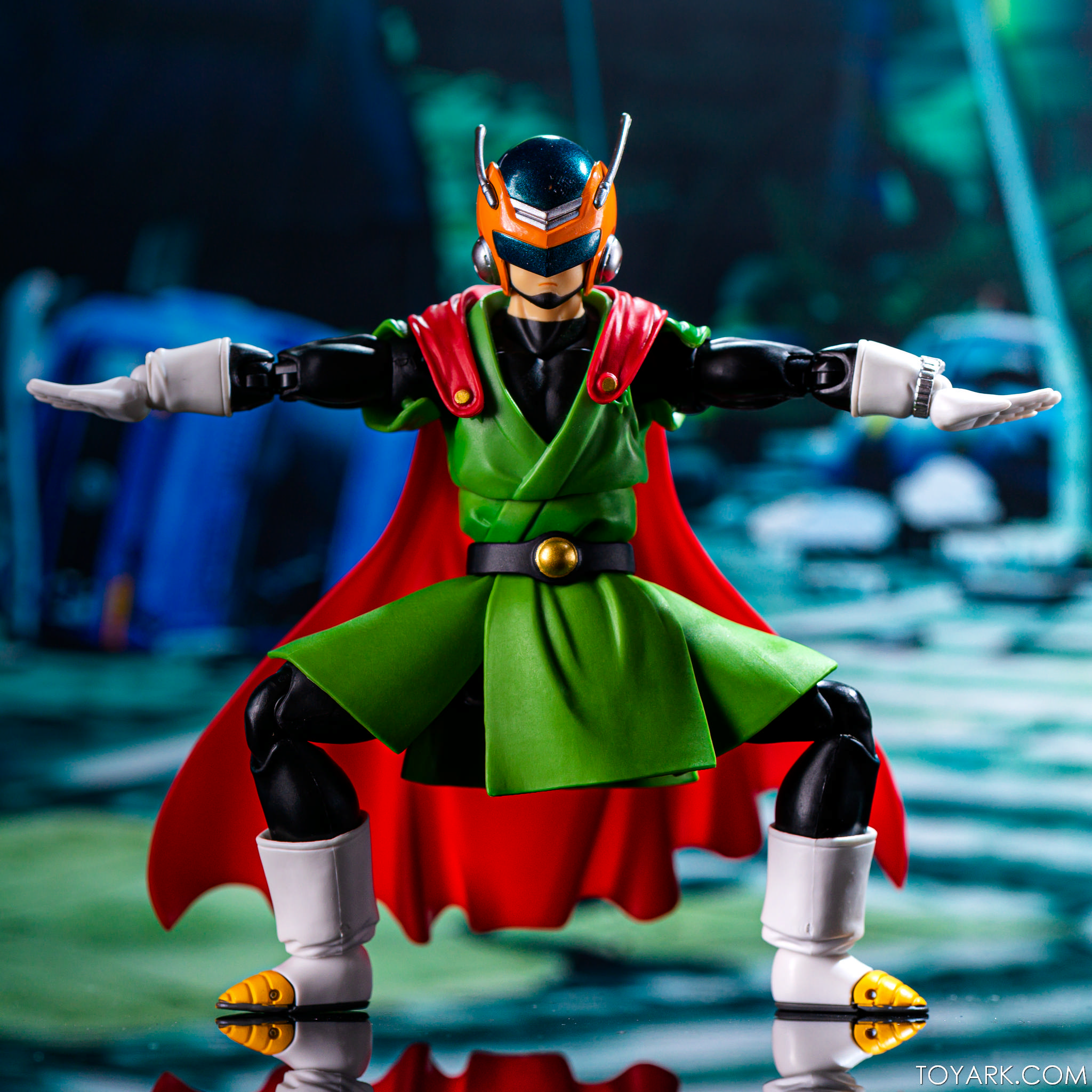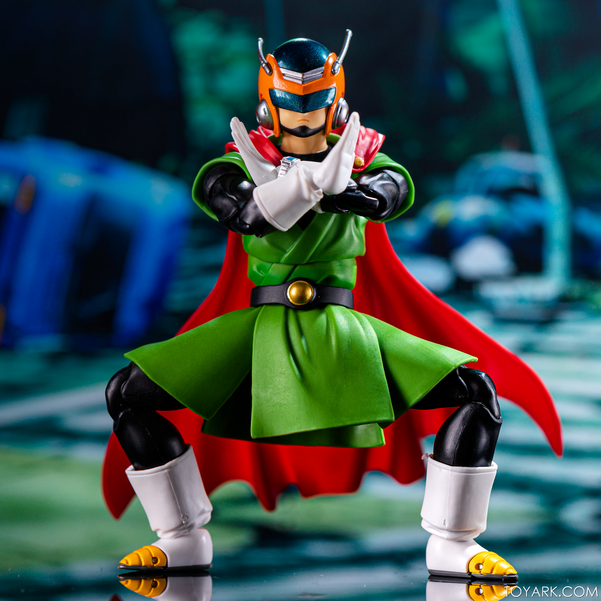 Time for another catch up gallery for the S.H. Figuarts Dragon Ball line. Today we are taking a look at the Great Saiyaman, aka (25 year spoiler alert) Gohan. This is Gohan’s super hero alter ego that he was using at the start of the Buu saga so he could help the people fight crime and still have a normal life. It was meant to be ridiculous and it was, but fans can’t get enough of him. He comes packed with his cape, helmeted head, doo-rag and glasses head, standard hair head, Super Saiyan hair head, forearms with and without the costume watch, 5 sets of hands, back peg for when he’s not using the cape, and an extra set of helmet antennae. As you can see, it’s well accessorized. Everything is sharp, with the Super Saiyan head really standing out. The standard hair head sculpt is a bit off, and the cape tech is wonky – the flaps never align right over the shoulders and the hard plastic cape falls out of the peg easily when posing. That being said, he’s still a solid release and worth picking up. The Buu Saga is filling out nice in the S.H. Figuarts line.