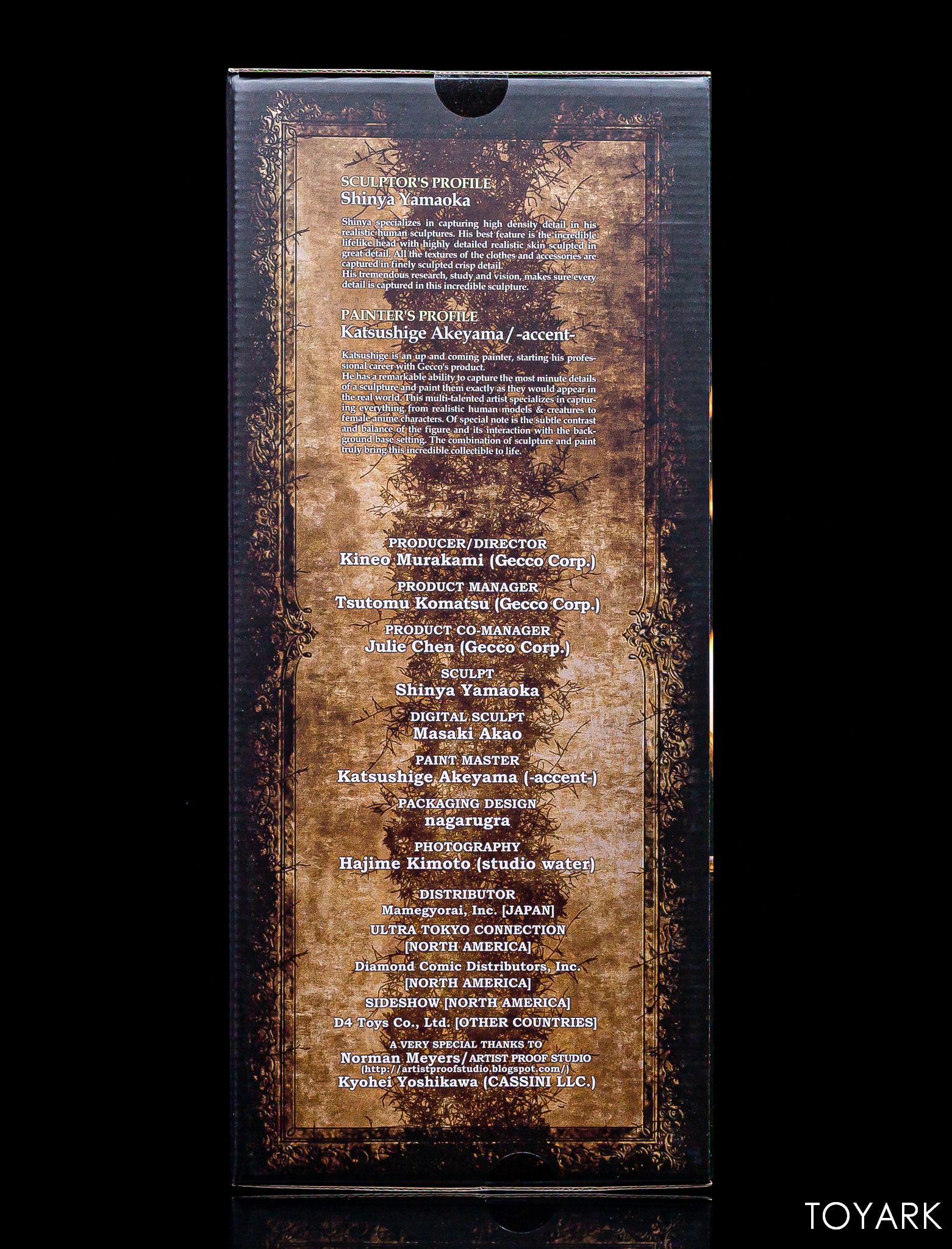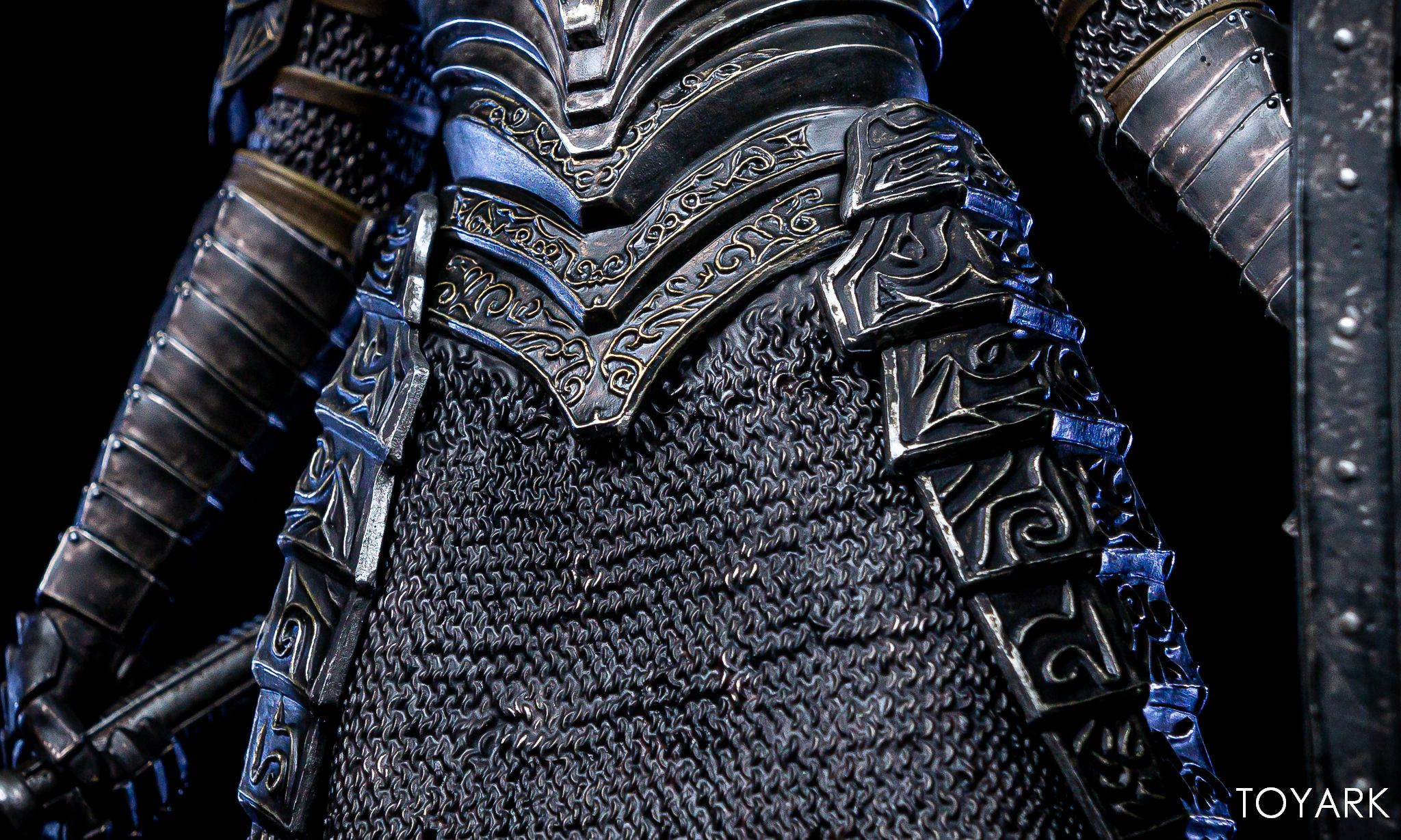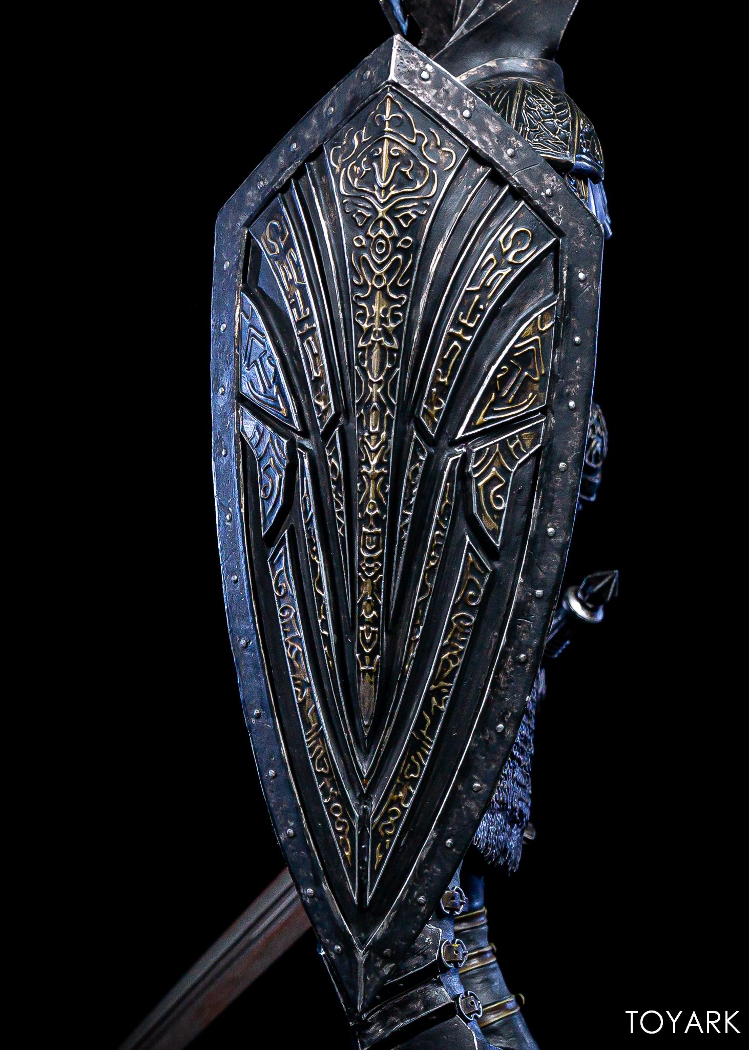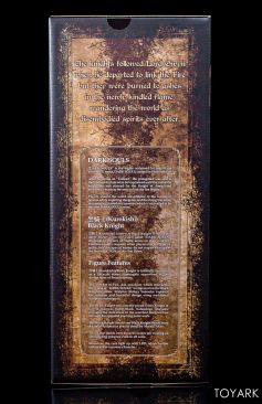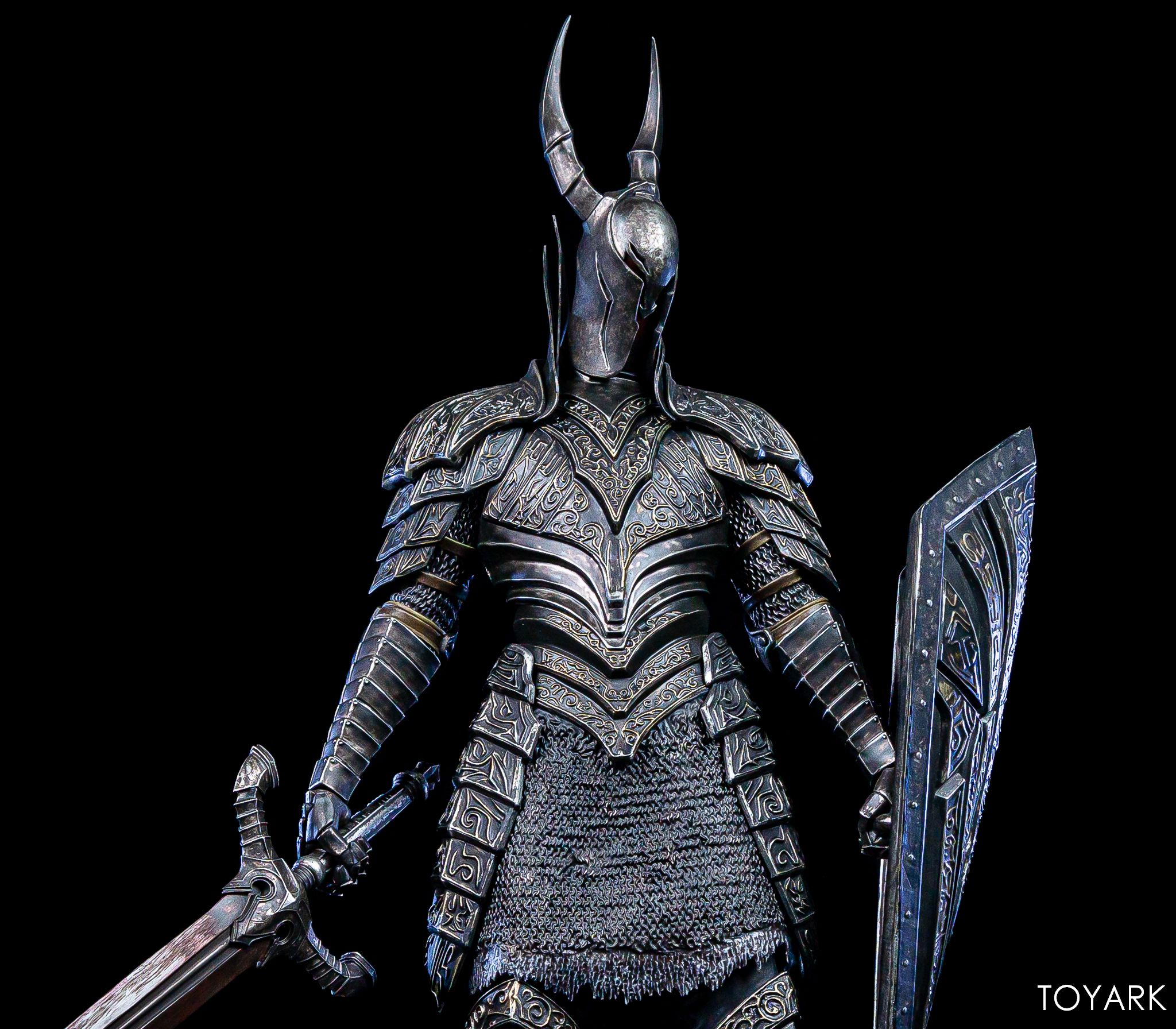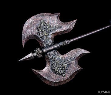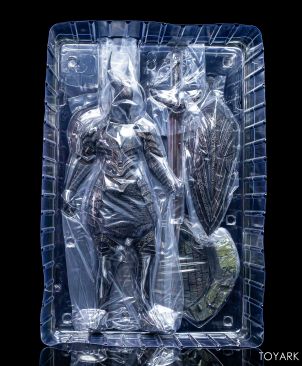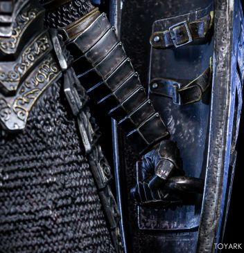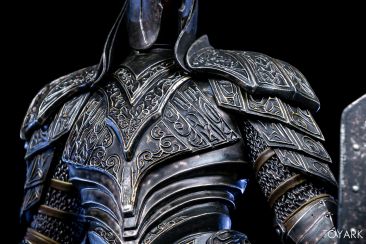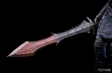 Highlighting the sculpt is another solid paint job by the artists at Gecco. While black is the main theme here, there’s quite a bit of brush work to add weathering to the armor and weapons. Subtle bits of gray, copper, and silver shine through the charred black, while additional pops of copper and silver paints add depth to the filigree on the armor, weapons and shield. Each of the weapons also has a bit of crimson red smeared on them, which evokes the look of aged, dry blood from those who crossed paths with the Knight.