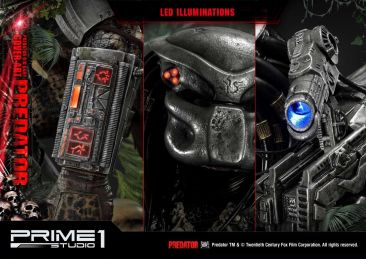 Some elements, like the net full of human skulls or his prey’s spinal cord faithfully reflects the Cover Art.The LED light-up function is included on Plasmacaster, Bio-Mask targeting laser and Wrist Gauntlet. This version includes a total of two Alternate Portraits, one Head Stand and three interchangeable Left Hands.