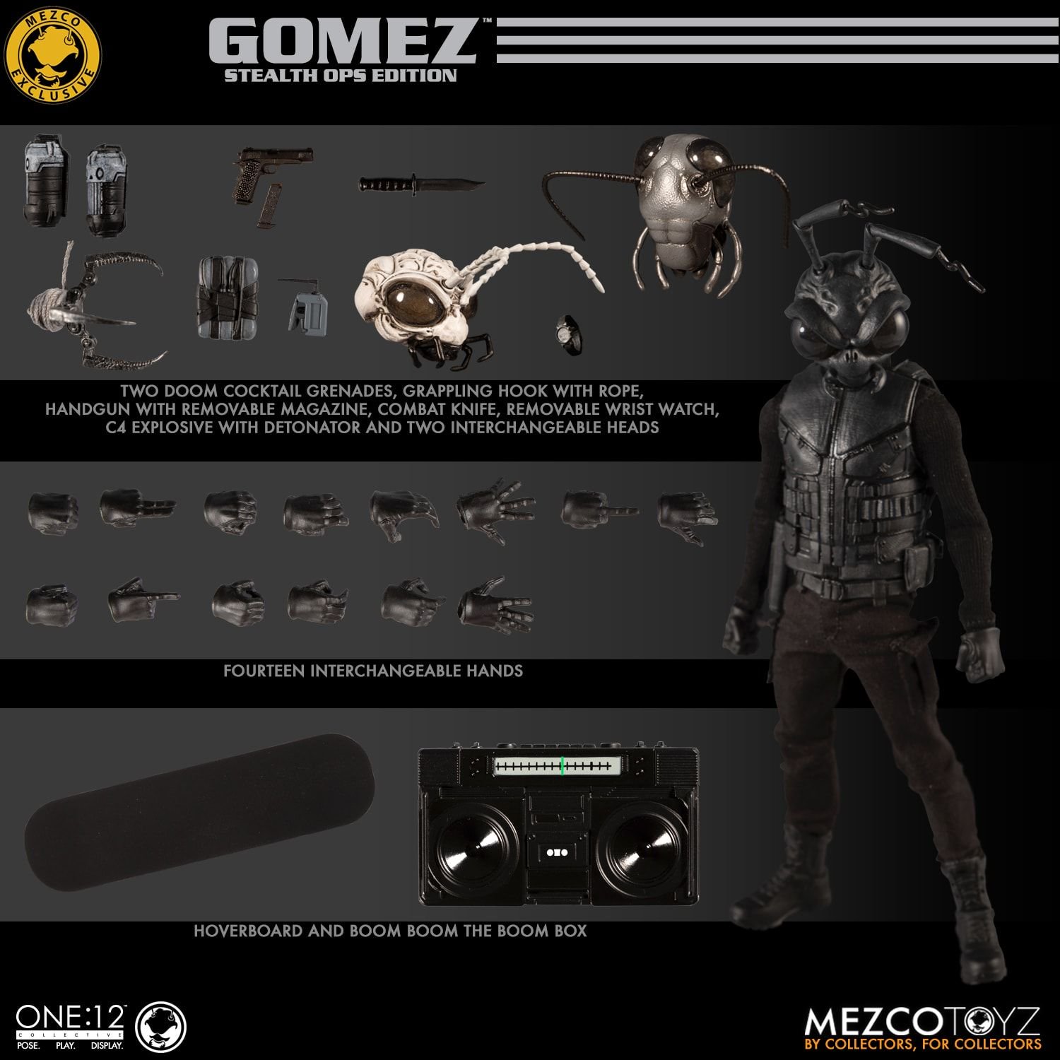 The One:12 Collective Gomez – Stealth Ops Edition is outfitted in all black – a turtleneck shirt, armored vest with handgun holster and knife sheath, cargo pants, and boots. Gomez is equipped with a high-tech hoverboard that magnetically attaches to his feet, and a backpack with adjustable straps and hook-and-loop closure.