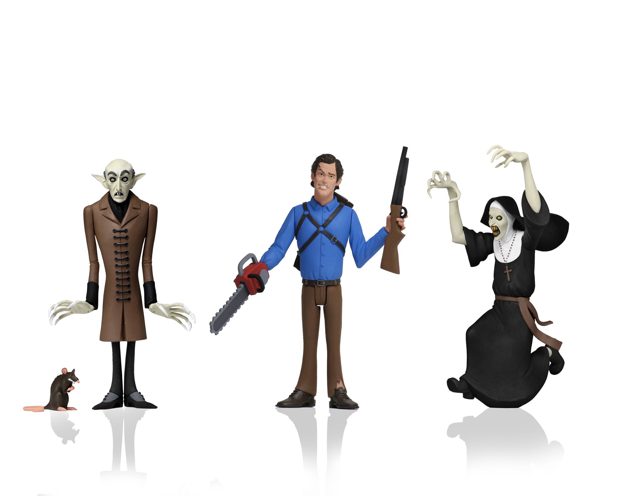 Standing approximately 6 inches tall, the action figure assortment includes Ash (Evil Dead 2) with shotgun accessory, The Nun (The Conjuring Universe) with painting accessory, and Count Orlok (Nosferatu) with rat accessory.