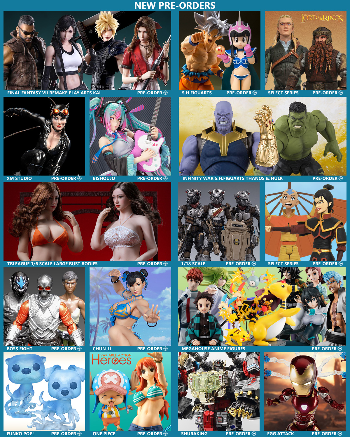 This week, S.H.Figuarts Thanos and Hulk have been announced based on their appearance in Infinity War, alongside the return of Ultra Instinct Goku and Kid Chi-Chi! The Select series continues with The Lord of the Rings Wave 1 and Avatar: The Last Airbender Wave 2. Final Fantasy fans can enjoy new Play Arts Kai figures based on the VII Remake; new anime and video game collectibles from MegaHouse, Bandai Spirits, Medicos, Kotobukiya, and Max Factory are now available for pre-order, too! Collect Bishoujo Hatsune Miku, Hexa Gear model kits, Ghost in the Shell’s Batou as a figma, Metal Build EVA Unit-02, and more for your collections. Customize your very own 1/6 scale female bodies from TBLeague to create a unique display.