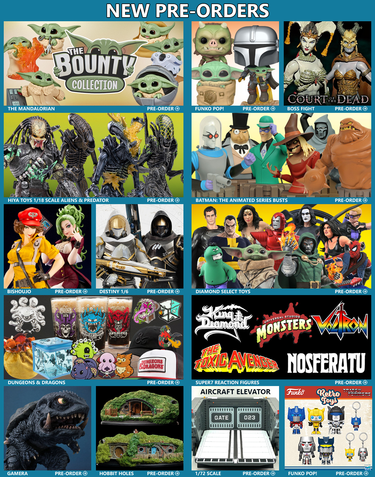 The Mandalorian is back with new Pop! figures, The Bounty Collection figures of The Child, FiGPiNs and a Premium Format statue as well. Boss Fight Studio has revealed two new figures from the Court of the Dead. G.I. Joe Lady Jaye and Beetlejuice are back with new color variants in the Bishoujo statue line. For 1/72 scale jets and Robotech figures, there is an aircraft elevator diorama piece that actually lifts up and down with sound effects. Six busts have been restocked from Batman: The Animated Series. There are new Alien and Predator figures from Hiya Toys. Diamond Select has shown new figures from Marvel, DC, The Mandalorian and The Crow. Threezero’s Destiny 1/6 line continues with two Hunter Sovereign figures. Tons of Dungeons & Dragons items are up including pint glasses, pins, hats and dice bags.