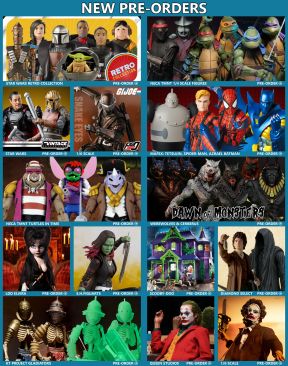 NECA is on fire this week with new TMNT: Turtles in Time figures and restocks of their 1/4 scale TMNT figures! The Mandalorian got the retro treatment with Hasbro’s Star Wars Retro Collection. There is a new line of figures with 9-inch werewolves and a Cerberus monster. The Armorer and Moff Gideon are joining The Vintage Collection. Threezero’s first G.I. Joe 1/6 scale figure will be Snake Eyes! The next figures in the MAFEX line include Ben Reilly Spider-Man and Azrael Batman. Diamond Select has a bunch of new figures, statues and busts from Lord of the Rings, Star Wars, Marvel and DC. The Queen of Halloween, Elvira Mistress of the Dark, joins the LDD Presents family!