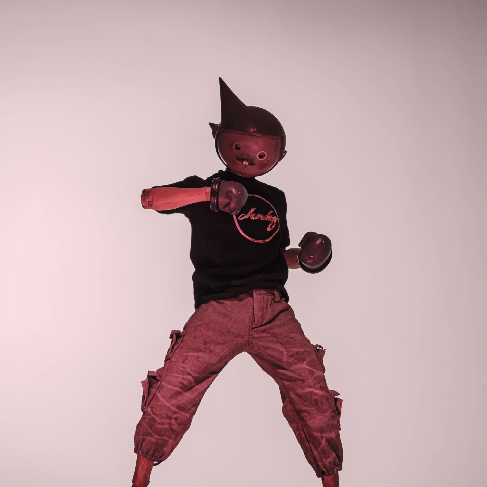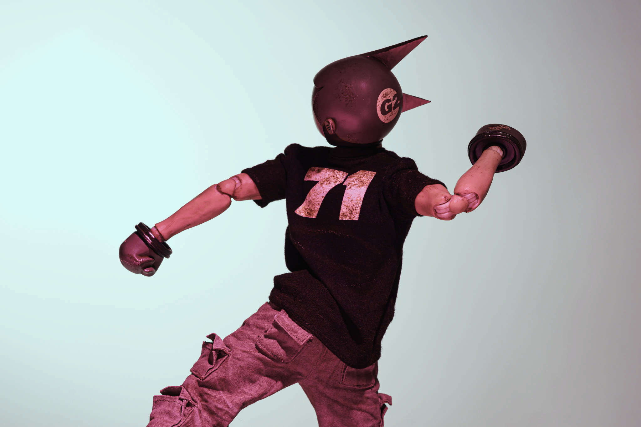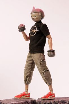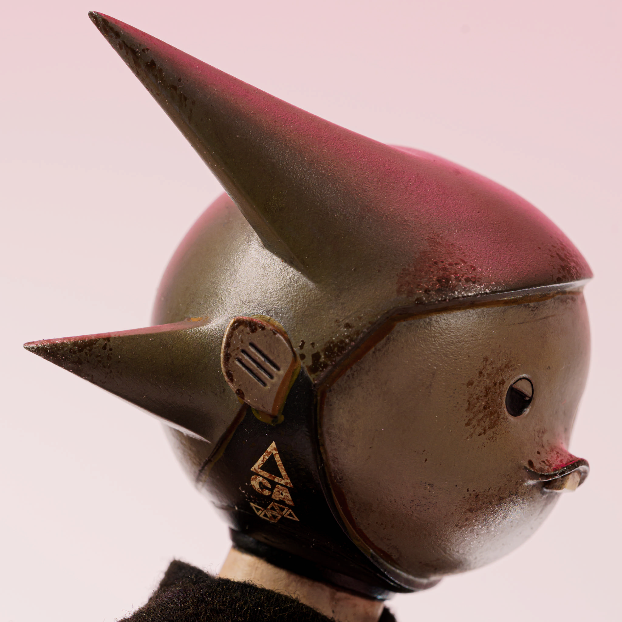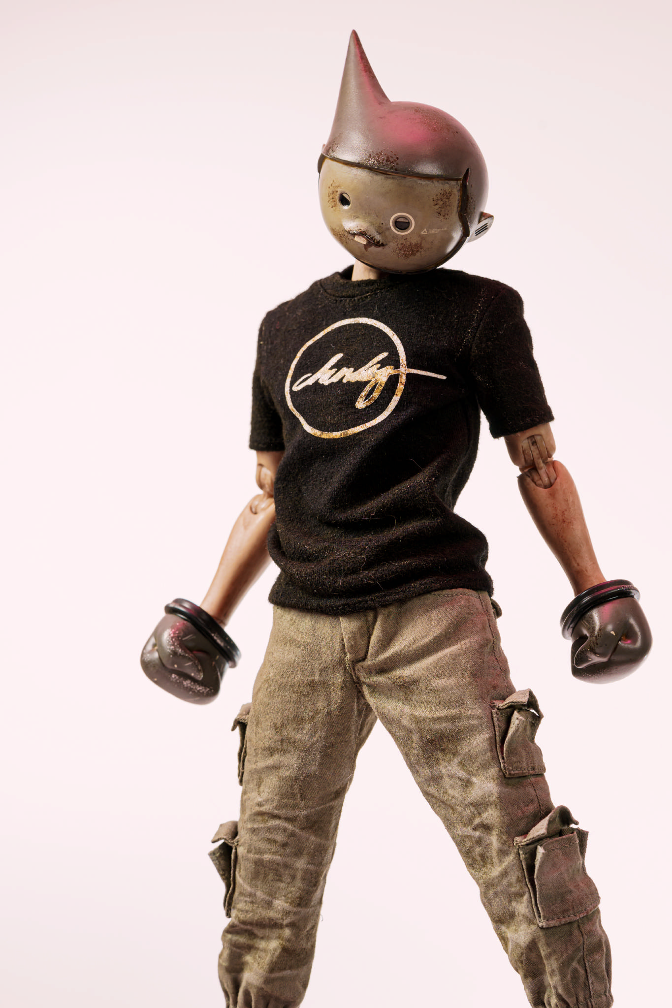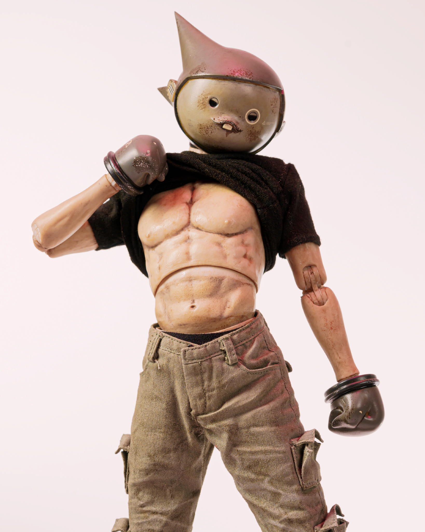 Their first full figure to initiate the jump back into gritty detailed toys is Coztro. He’s 1/6th scale and is in the ASHTRO LAD universe, Ashtro Lad being his take on an Astro Boy style bot. Coztro is not a bot though, new storylines reveal he’s one of many freedom fighters that adopt the Ashtro Lad helmet and some steel boxing gloves in order to battle the evil WOMM. They toy plays on this by being shipped blind boxed with one of four color schemes.