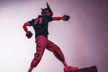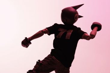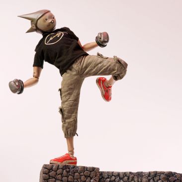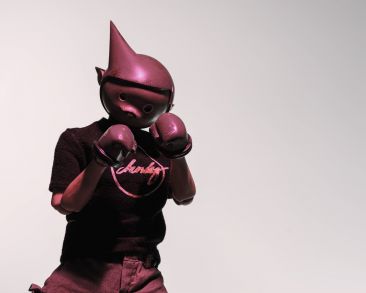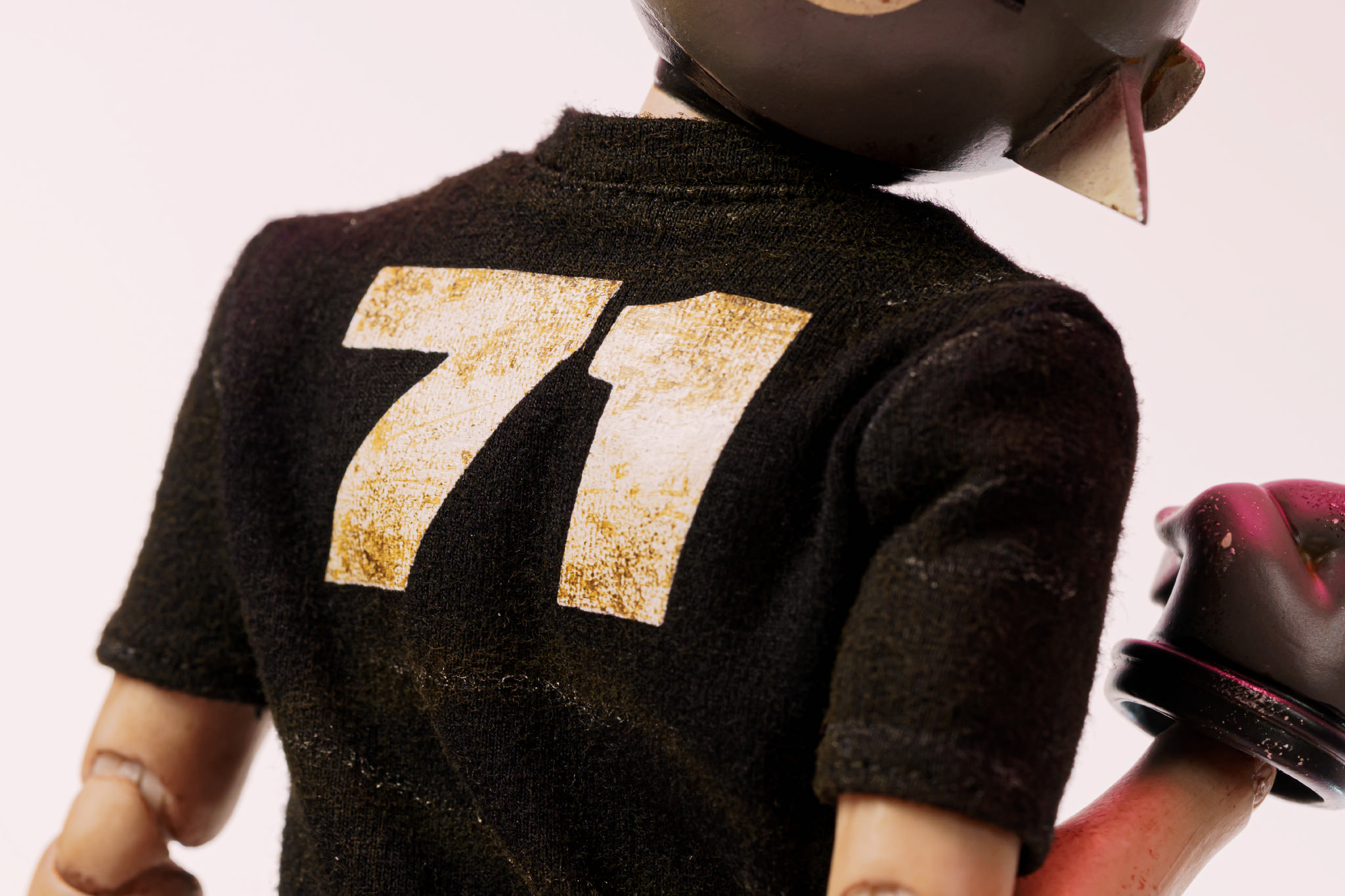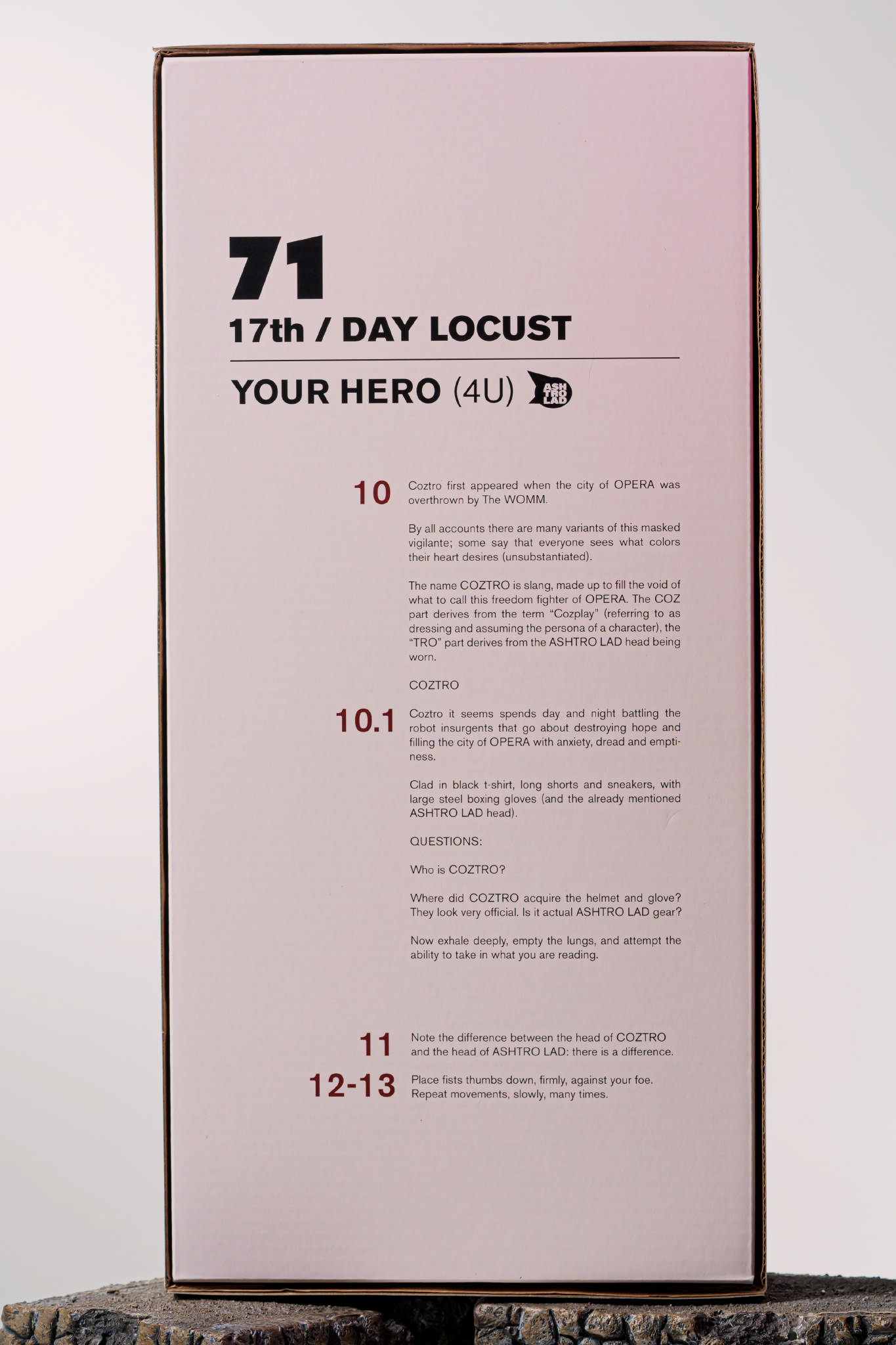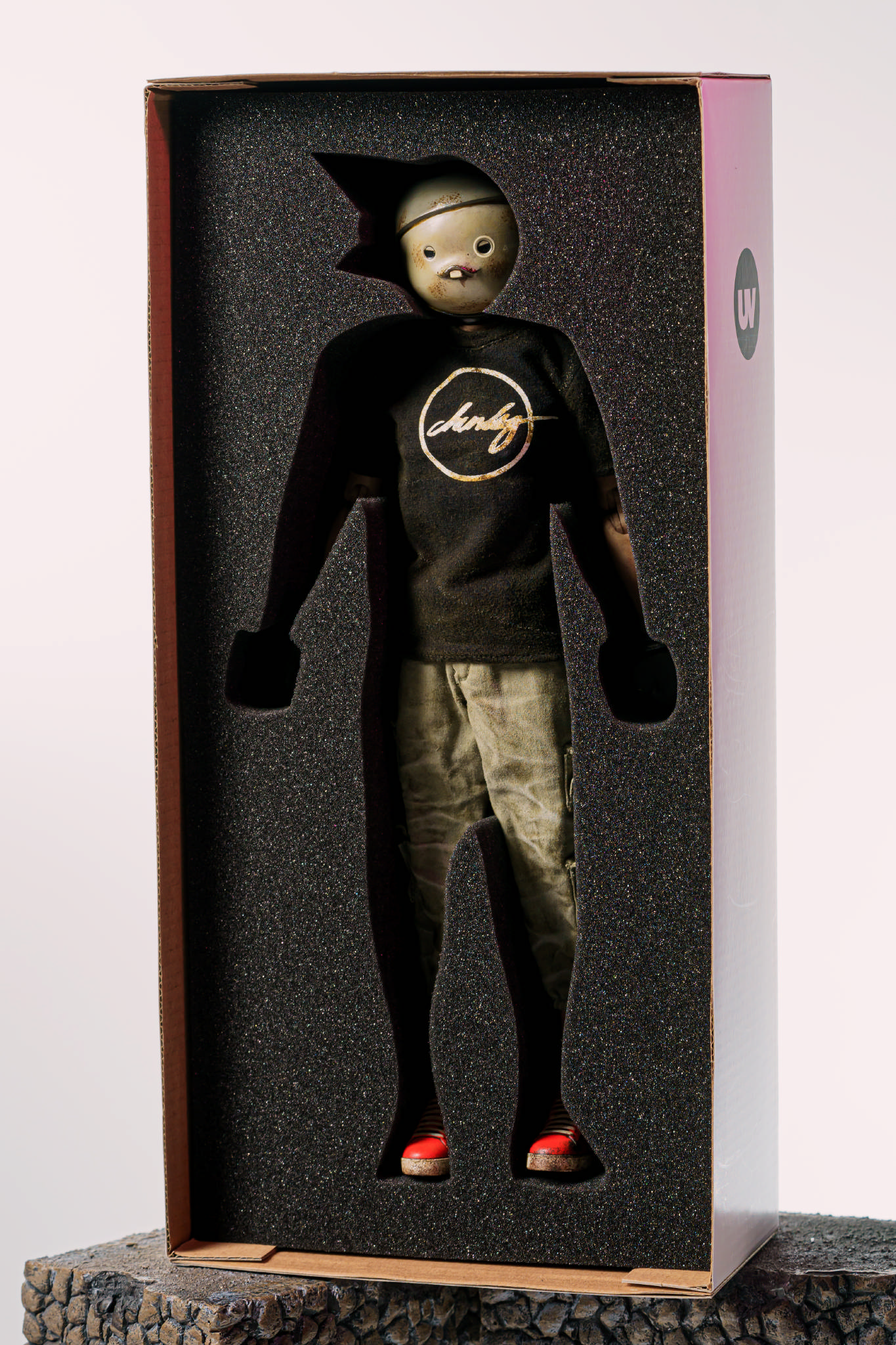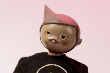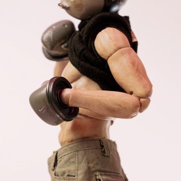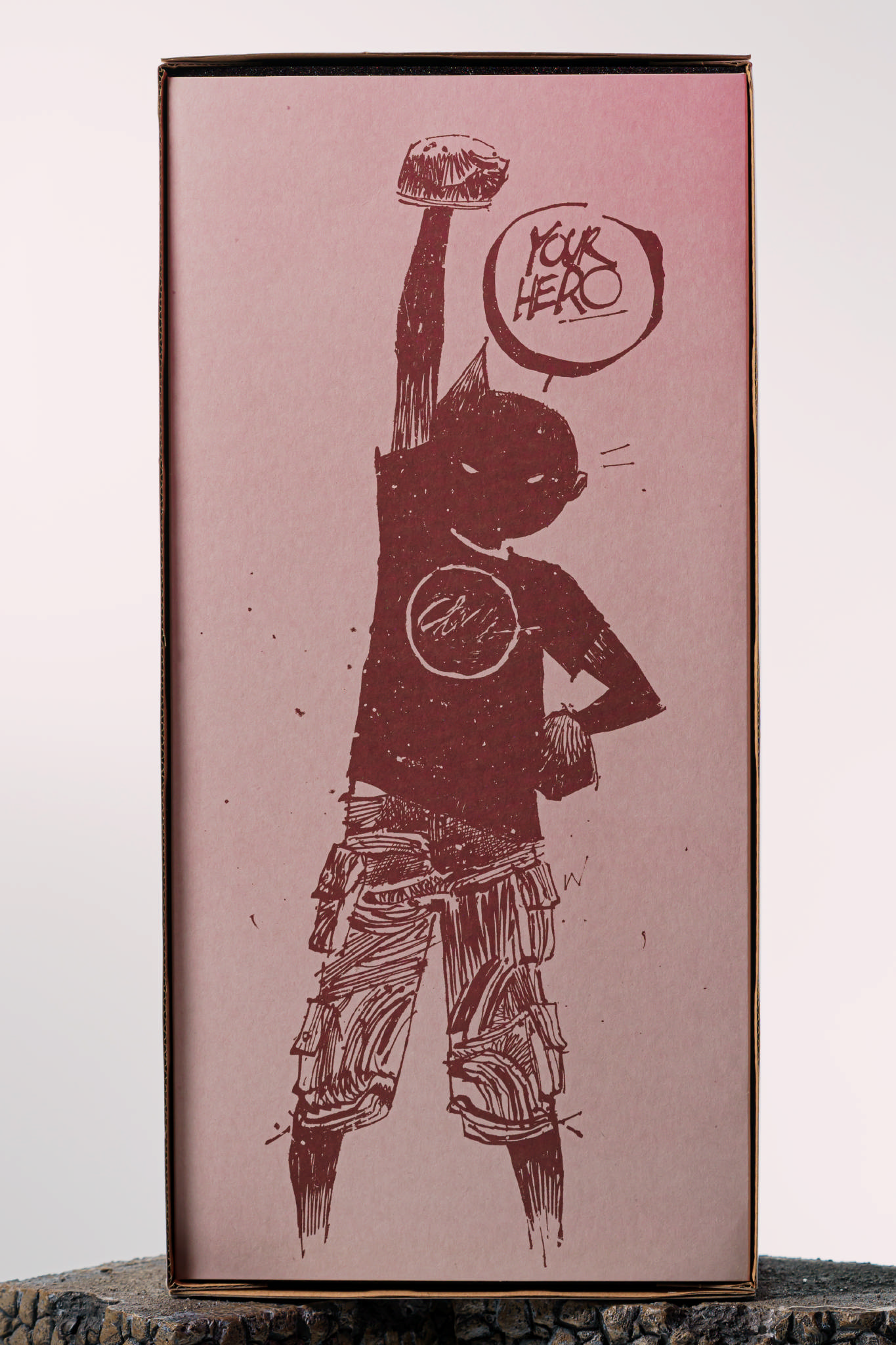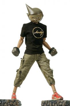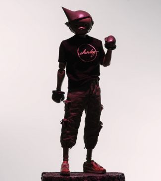 Their first full figure to initiate the jump back into gritty detailed toys is Coztro. He’s 1/6th scale and is in the ASHTRO LAD universe, Ashtro Lad being his take on an Astro Boy style bot. Coztro is not a bot though, new storylines reveal he’s one of many freedom fighters that adopt the Ashtro Lad helmet and some steel boxing gloves in order to battle the evil WOMM. They toy plays on this by being shipped blind boxed with one of four color schemes.
