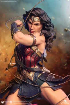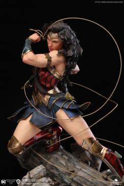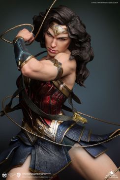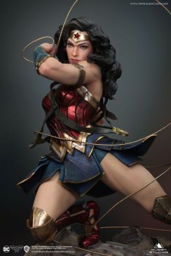 Photos and details have been released by Queen Studios for their upcoming Wonder Woman 1/4 Scale Statue. The statue stands at 18.5″ tall on a diorama base, and is cast in polystone. The statue takes most of its design from Wonder Woman’s recent film appearances, with a realistic sculpted costume, and a dynamic looking Lasso of Truth. The statue will include two interchangeable head sculpts. The first is based on Gal Gadot as Wonder Woman, the second is a comic inspired head sculpt.