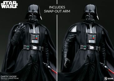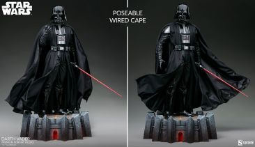 The resin Darth Vader Premium Format Figure is a mixed media piece with an elaborate sculpted bodysuit accompanied by carefully tailored fabric elements to add depth and drama to your dark side display. Vader’s pants, armor pieces, gloves, and boots are all sculpted to capture realistic costume textures and movement as well as the stunning, glossy finish on his signature helmet. His black fabric cape and tunic feature wiring in the hems, allowing you to craft a dynamic pose for these pieces, and his belt features additional fabric elements. This Darth Vader figure includes two swap-out right hands for alternate display, one lowered at his side and one raised in a Force-wielding gesture.