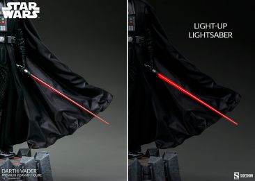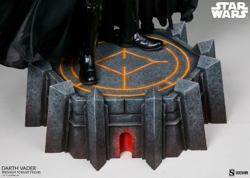 The Darth Vader Premium Format Figure measures 25” tall and 14” wide as the Sith Lord stands regally and ruthlessly atop a Mustafar castle themed base. With stonelike texture and fiery red and orange paint applications, this fortress serves as Vader’s volcanic headquarters in his quest to crush the Rebellion. Clutching his iconic red lightsaber, which includes a light-up feature, the Dark Lord of the Sith is a menacing figure facing off against any foe.