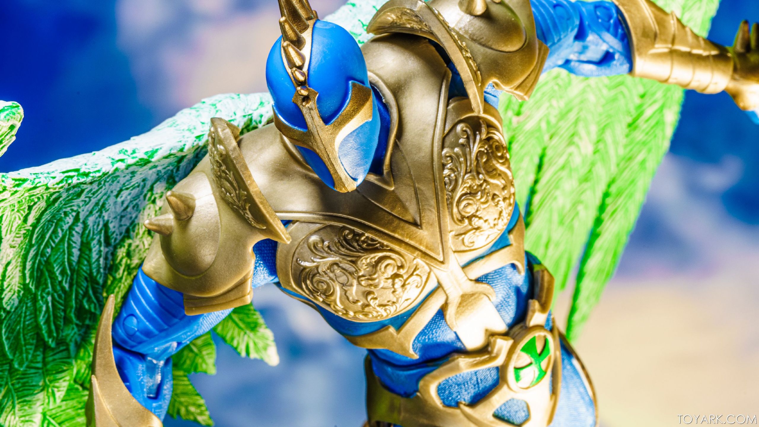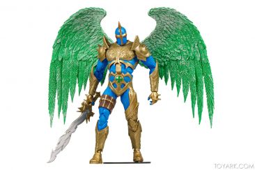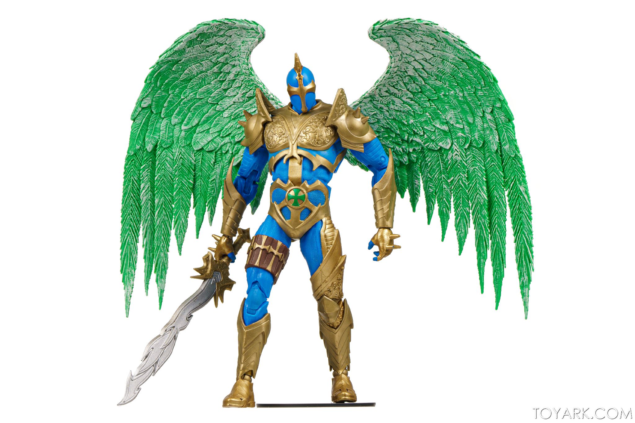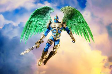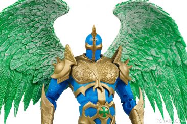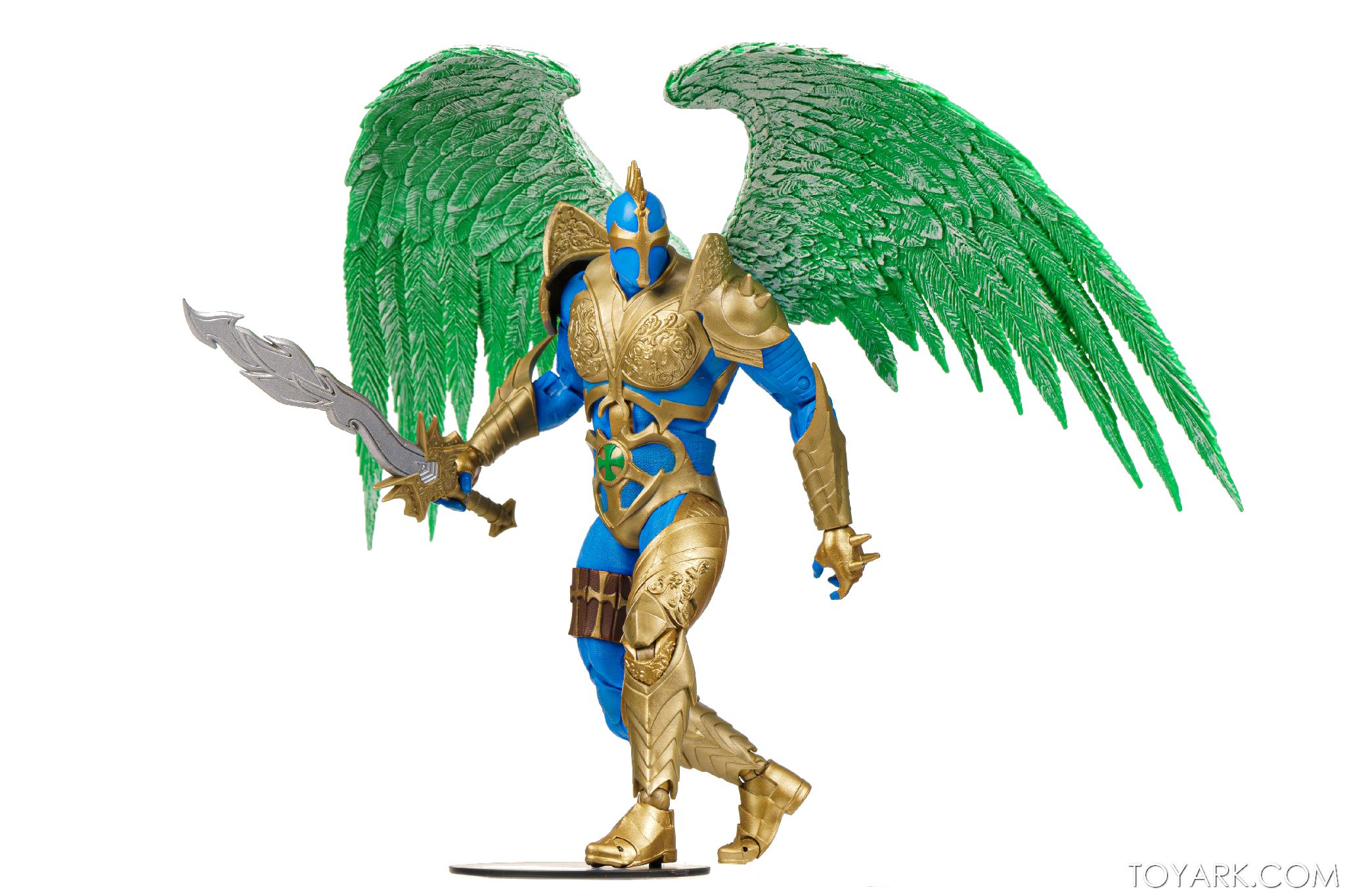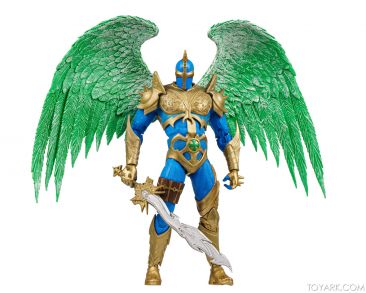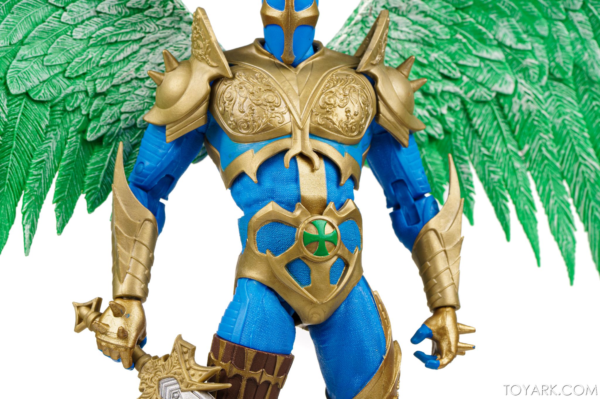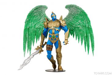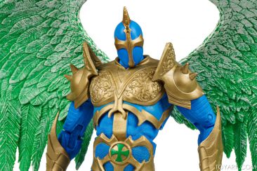 Redeemer – Modern take. The one featured here is actually a chase variant, branded with a Platinum Edition sticker. This variant features green wings and a different sword. The regular one has white wings and another sword. The green wings are a call back to his old look, featured on some art and older toys. Current look has the white wings in the book. Great sculpt, there is nice texture on the blue parts. Gold has a metallic sheen. My copy the joints were a little loose and the wings are heavy, so took a bit to get him to stand up at times. Looks great when set properly tho.