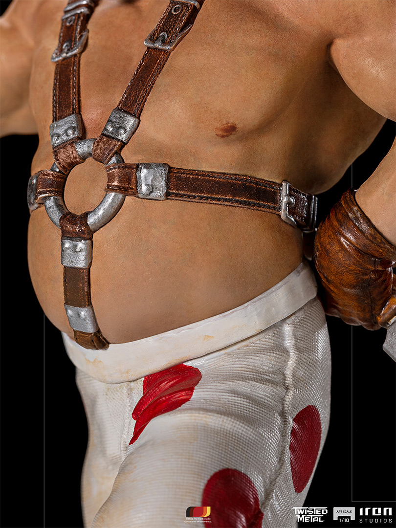 A twisted metal door with cracked glass, one of the wheels with a wide tire, a decorative clown head on the roof, and a minigun rotary machine gun, make up the wreckage of the ice cream and destruction van, piled up, forming its base diorama. Dressed in military boots with colorful pants and his unmistakable and threatening clown mask, the stout giant with flaming hair has his big gloved right hand raised as if to grab something while trying in vain to hide a machete in his left fist behind his back. Thus Iron Studios adds another successful franchise of games to its line with the statue of the fearsome “Sweet Tooth Needles Kane – Twisted Metal Art Scale 1/10 – Iron Studios”, already available for Pre-Order.