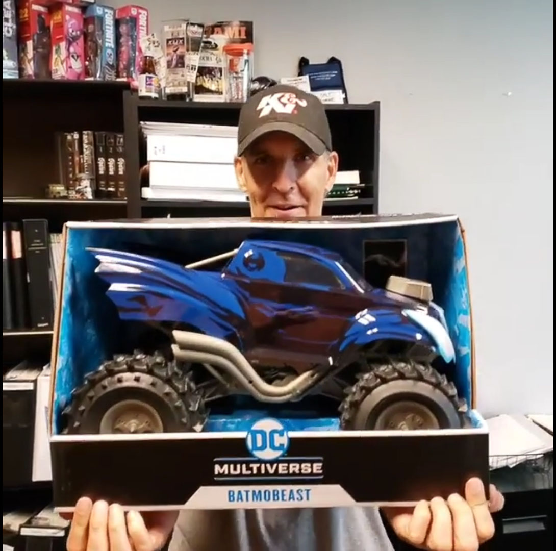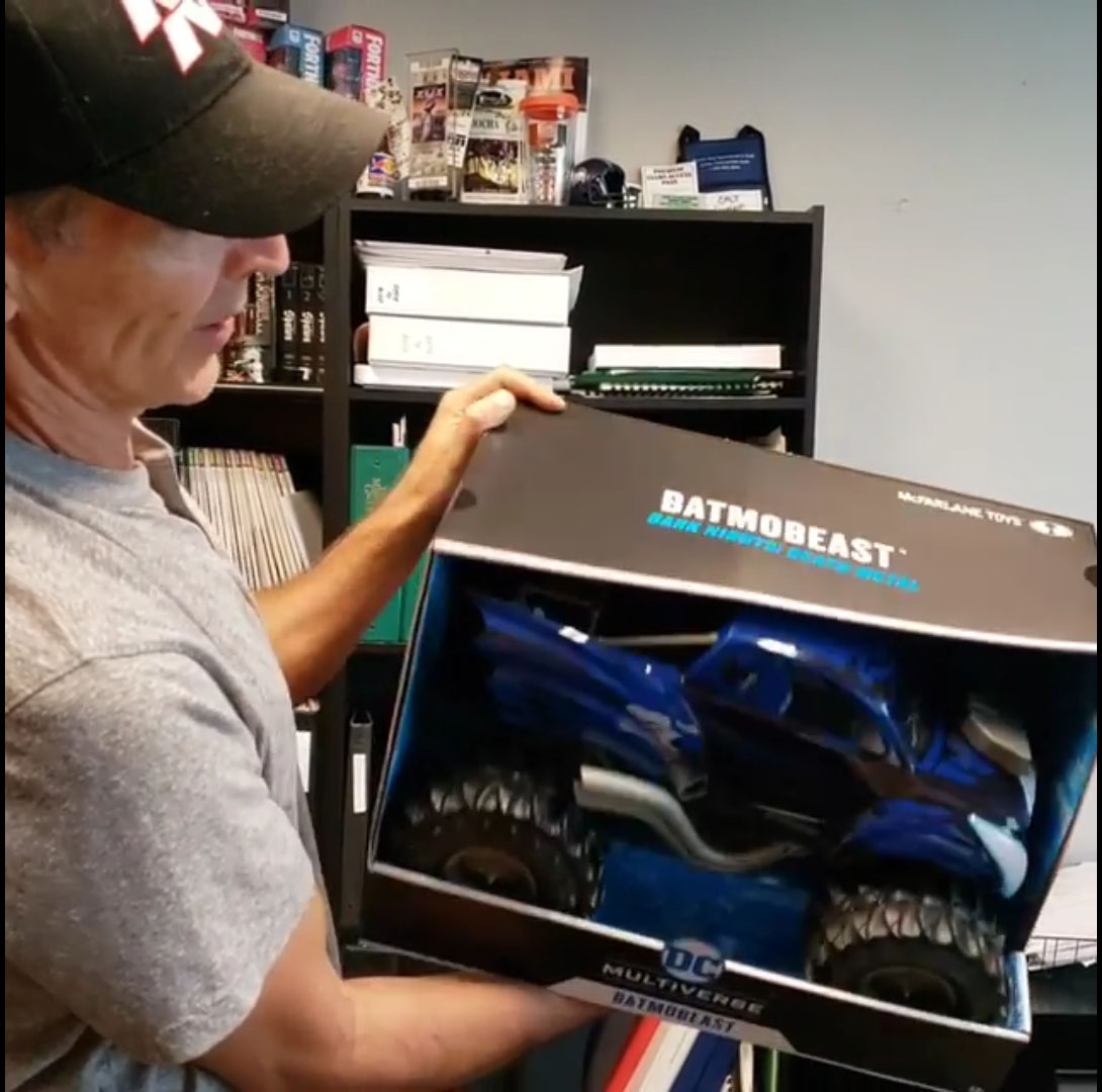 In the DC Comics Dark Nights Death Metal story, a number of Batmen from a number of Earth’s converge to wreak havoc on Earth-1. One of those is a Batman whose conciseness resides inside a monster truck, and he calls himself Batmobeast. Todd McFarlane, on an Instagram Live Video, revealed the fully packaged DC Multiverse 7″ Scale Batmobeast, one of his largest toys ever. At this time, however, there’s no set release date or price available. See a few screen caps after the jump.