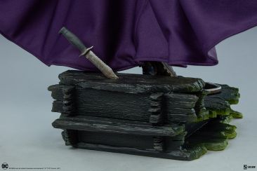 The Huntress Premium Format Figure measures 20” tall and 17.25″ wide as Helena Bertinelli confidently strolls down to the seedy docks of Gotham, looking to bust a mafia racket. The rotting wood boards add to the dramatic atmosphere of the criminal underbelly of this notorious city, and the base is littered with the discarded weapons of her targets. With her bo staff draped casually over her shoulders, this master martial artist sets her sights on taking out anyone who stands in her path.