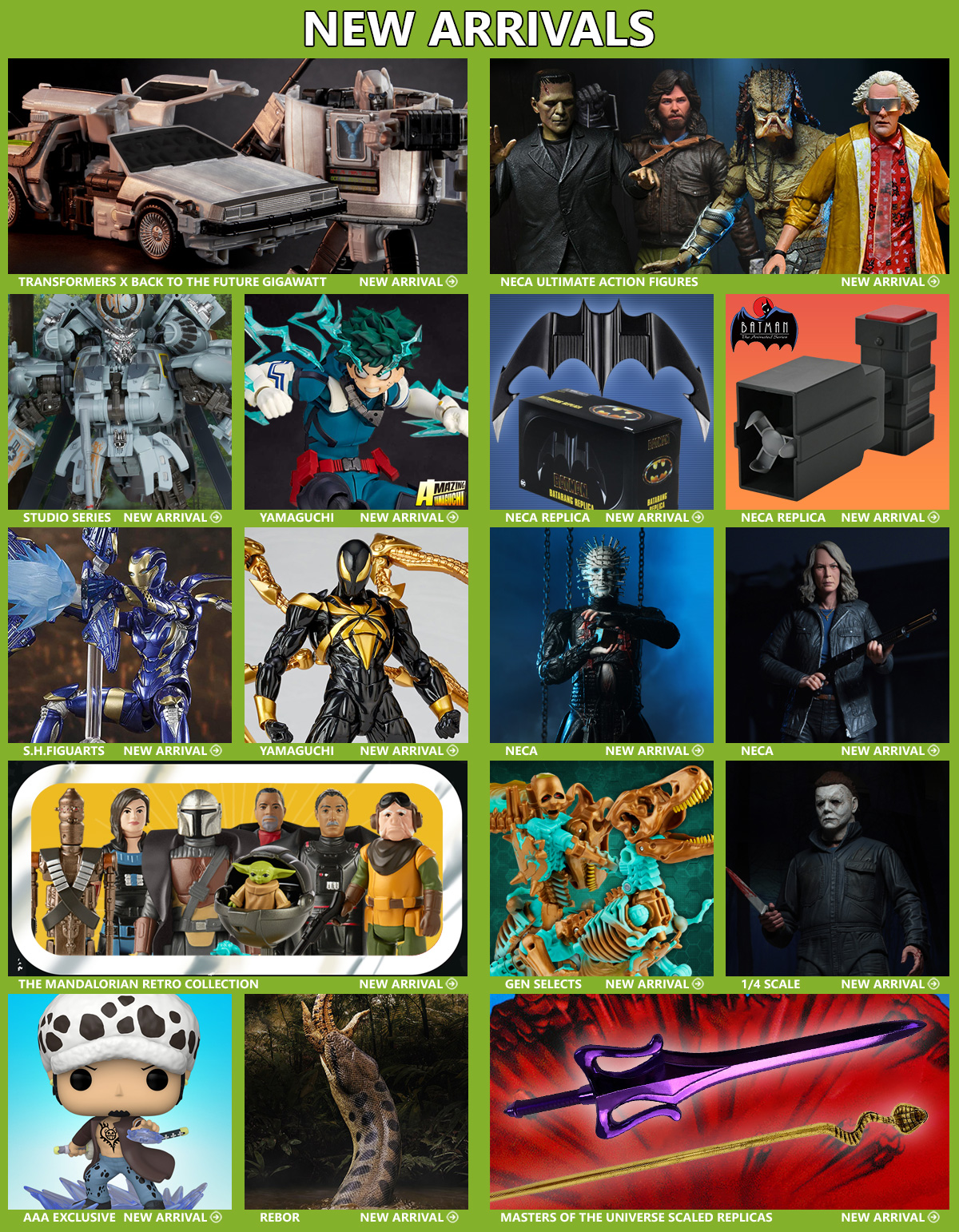 NECA’s Ultimate action figure have arrived! From Frankenstein to Back to the future to The Predator, these action figures have all the articulation fans expect with tons of accessories. From the My Hero Academia anime, Izuku Midoriya joins the Revoltech Amazing Yamaguchi action figure series wearing his hero suit. Standing about 6 inches tall, Izuku boasts 28 points of articulation for extreme posing possibilities and includes a wide selection of accessories. This Studio Series 73 Leader Class Transformers: Revenge of the Fallen-inspired Grindor figure converts from robot to Sikorsky helicopter mode in 46 steps. These Star Wars 3.75-inch-scale Retro Collection figures are detailed to look like the characters from The Mandalorian live-action series on Disney Plus, featuring design and detailing inspired by 1970s Star Wars figures. Introducing NECA’s first release from their DC Prop Replica line, the Batarang from the 1989 film, Batman.