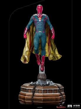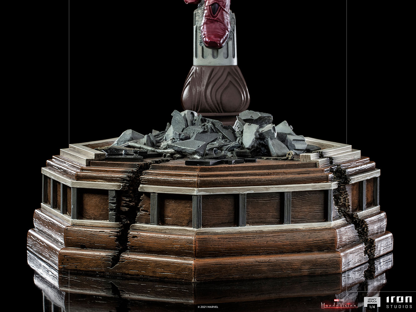 Above the destroyed remains of a library pillar located in the town of Westview is the synthezoid avenger, an artificially created humanoid being. After being revived by his beloved sorceress wife, through the Magic of Chaos, he rises, floating, with clenched fists and a grim countenance, ready to combat any threat to his family, even though he is a ghostly version of his reassembled body, without his memories and his love for Wanda Maximoff. Inspired by the latest episode of the Disney+ streaming TV series Wandavision, Iron Studios presents the “Vision – Wandavision – Legacy Replica 1:4 Statue”, where the hero faced himself in defense of his beloved wife and children.