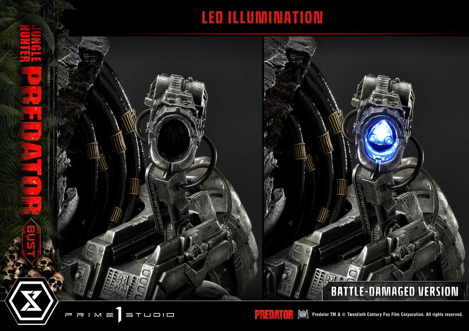 We have outfitted the Jungle Hunter Predator Bust, Battle-Damaged Version with his Bio-Mask with a battle-damaged look. It portrays a Jungle hunter Predator that has met with some kind of considerable resistance in the past! Enough to make a large gash on his Bio-mask! Furthermore, we have equipped this bust with an LED Illuminated Plasma Cannon, so that you can proudly display this beast as it is ready to lay waste to everyone around it.