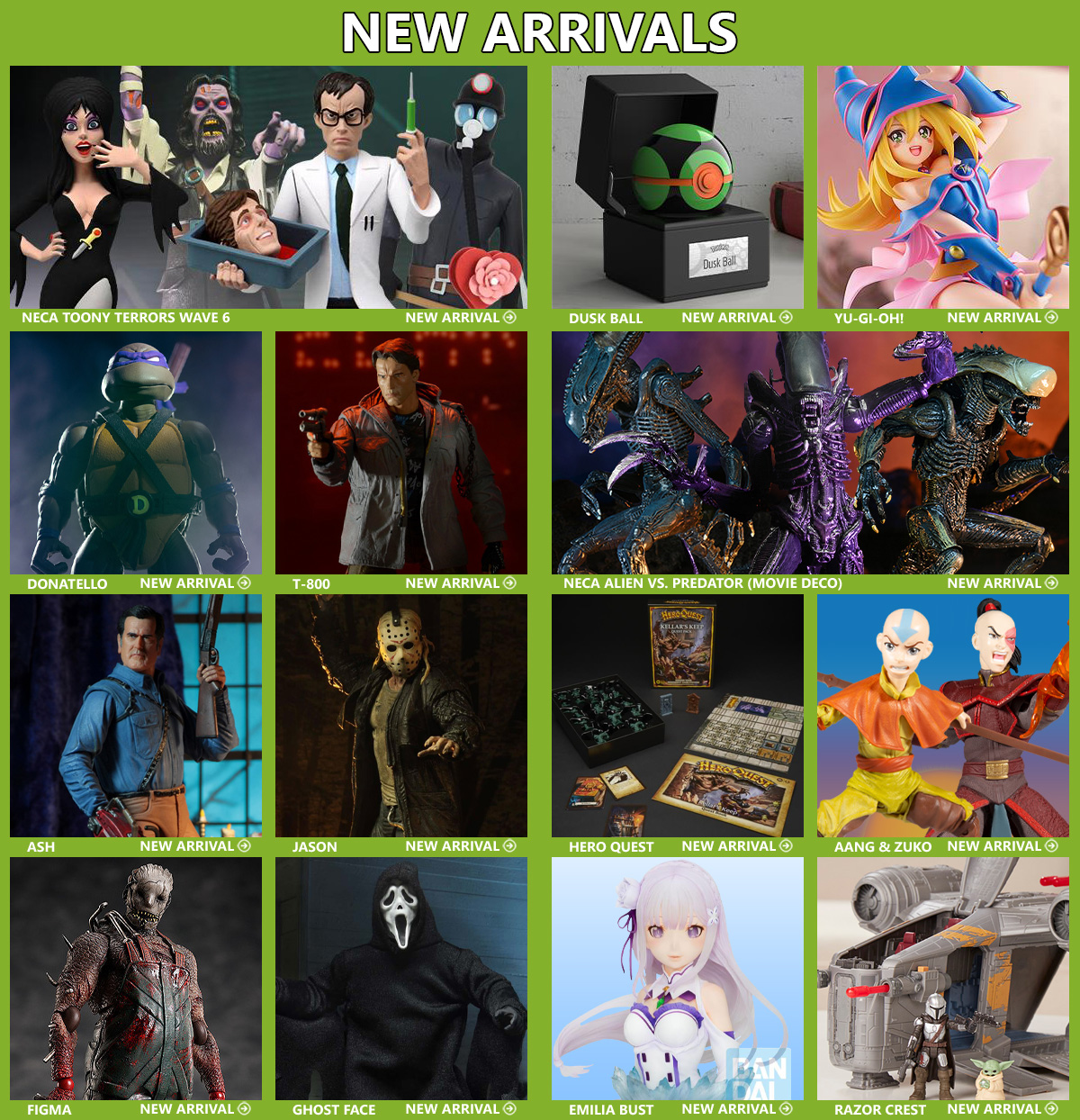 The Toony Terrors from NECA have arrived, featuring Elvira, Herbert West, The Miner, and Captain Blake! Pokemon’s Dusk Ball Electronic Replica is here! Fly away with Yu-Gi-Oh’s Dark Magician Girl, now in stock! NECA’s TMNT Ulimates Donatello is here to save the day with his brilliant brains! I’ll be back, and he is here, the Terminator Ultimate T-800 Figure (Tech Noir)! The unprecedented, awesome, Alien vs. Predator figure set mash-up has arrived! Ash Williams from the hit TV series Ash vs. Evil Dead is now in stock, complete with his trusty (hopefully not rusty), chainsaw hand! Now in stock is the 2009 version of Jason Voorhees, brought to us by NECA’s Ultimates! Have some fun this New Year with the Hero Quest games! McFarlane Toy’s Aang and Zuko from Avatar: The Last Airbender have arrived! The always-smiling killer, The Trapper, from the Dead by Daylight video game is newly arrived! As part of the Ultimates figure line, one of the greatest 90’s slashers is here, Ghost Face! Admire the now in-stock, beautiful, life-size, Ichibansho bust of Emilia from Re:Zero Starting Life in Another World! Mando, The Child, and The Razor Crest have safely landed on our New Arrivals page!