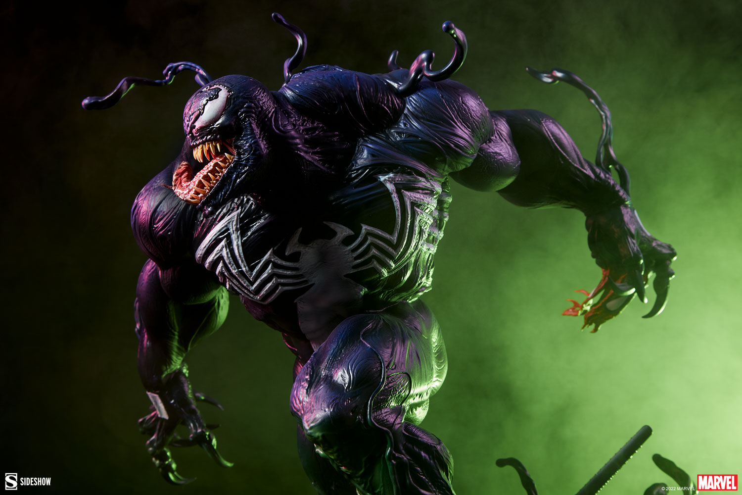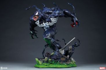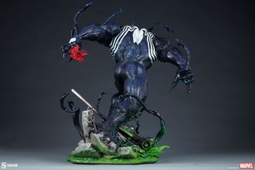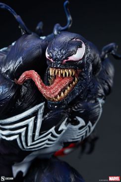 The Venom Premium Format Figure measures 23.12” tall and 18.56″ wide as the monstrous symbiote stalks his prey in the sewers beneath Oscorp Labs. Under his feet, remnants of the Goblin Glider are consumed by green chemicals and in his powerful claws he holds Peter Parker’s signature Spider-Man mask, torn to shreds. Enemies beware — when Venom’s lashing tongue and gnashing teeth are exposed in a wicked grin, you might make his next meal!