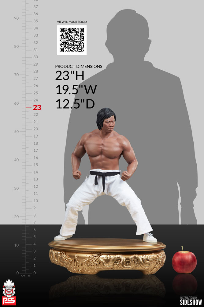The Bolo Yeung: Jeet Kune Do Tribute Autograph Edition 1:3 Scale Statue measures 23” tall and 19.5” wide as an expertly sculpted homage to the renowned Chinese actor, bodybuilder, and martial artist famed for his antagonistic action movie roles. This ultra-realistic and highly detailed statue showcases the athleticism, intensity, and immense discipline exhibited by Yeung in early film appearances that made him a fan-favorite on-screen fighter.