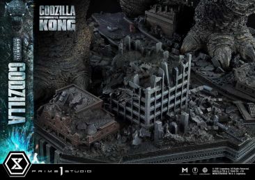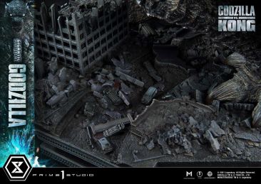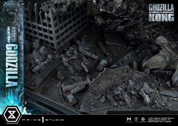 Godzilla stands on a polystone base, themed to a film-appropriate, rubble-strewn, city ruins environment, clearly devastated by his thunderous appearance.