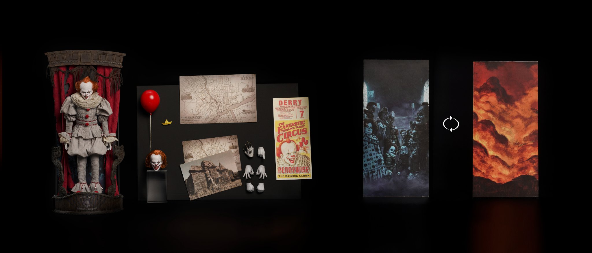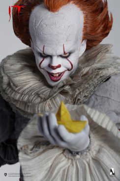 This life-like 1/6 scale figure captures Pennywise (IT) with stunning accuracy, sparing no detail with the clothing and character likeness. Pennywise stands on a stage which has a double-sided background, allowing the collector to choose how they want to present IT. This one-of-a-kind collectable features switch-out hands, three head-sculpts, it also includes a toy paper boat and balloon. To pay homage to the original 1990 miniseries and the more recent 2017 movie; the team have included a map of the town where the story is set, and a classic circus advertisement.