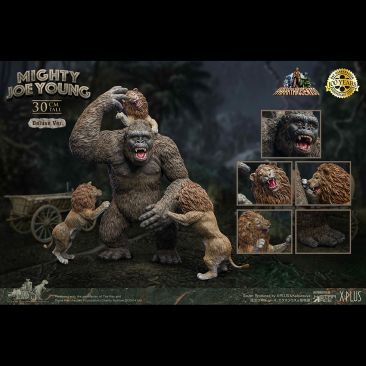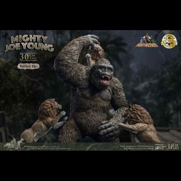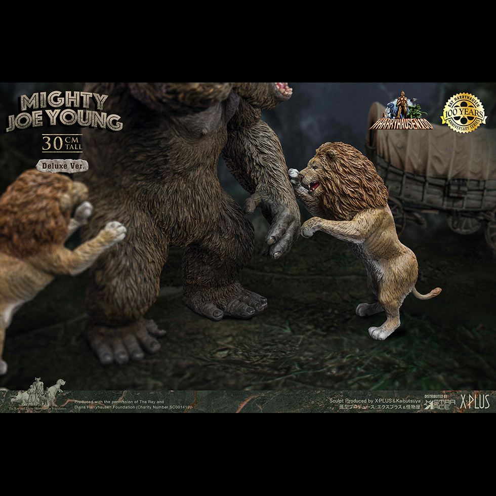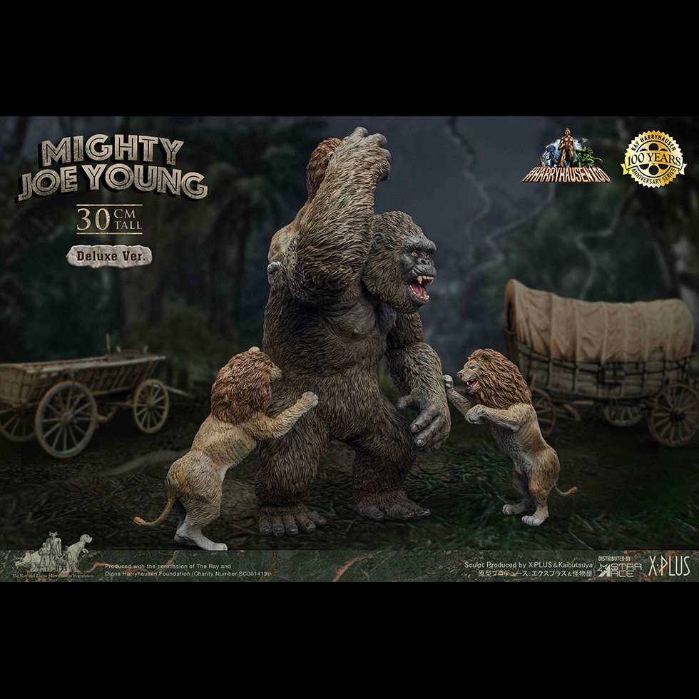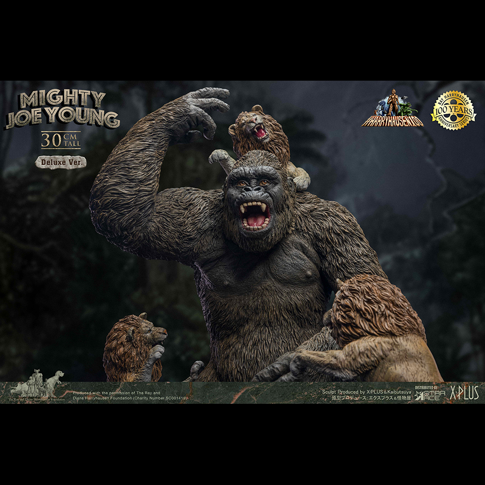 The latest collectible in the Ray Harryhausen’s 100th Anniversary collection has been revealed by Star Ace Toys. The Mighty Joe Young Statue by X-Plus features Ray Harryhausen’s oversized gorilla battling a lion as seen in the 1949 film. A Deluxe Version will also be available, which adds two additional lions for a larger display. The statue stands over 13″ tall. Mighty Joe Young is cast in soft vinyl, while the lions are cast in polyresin.