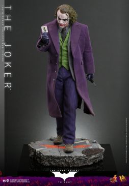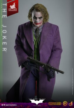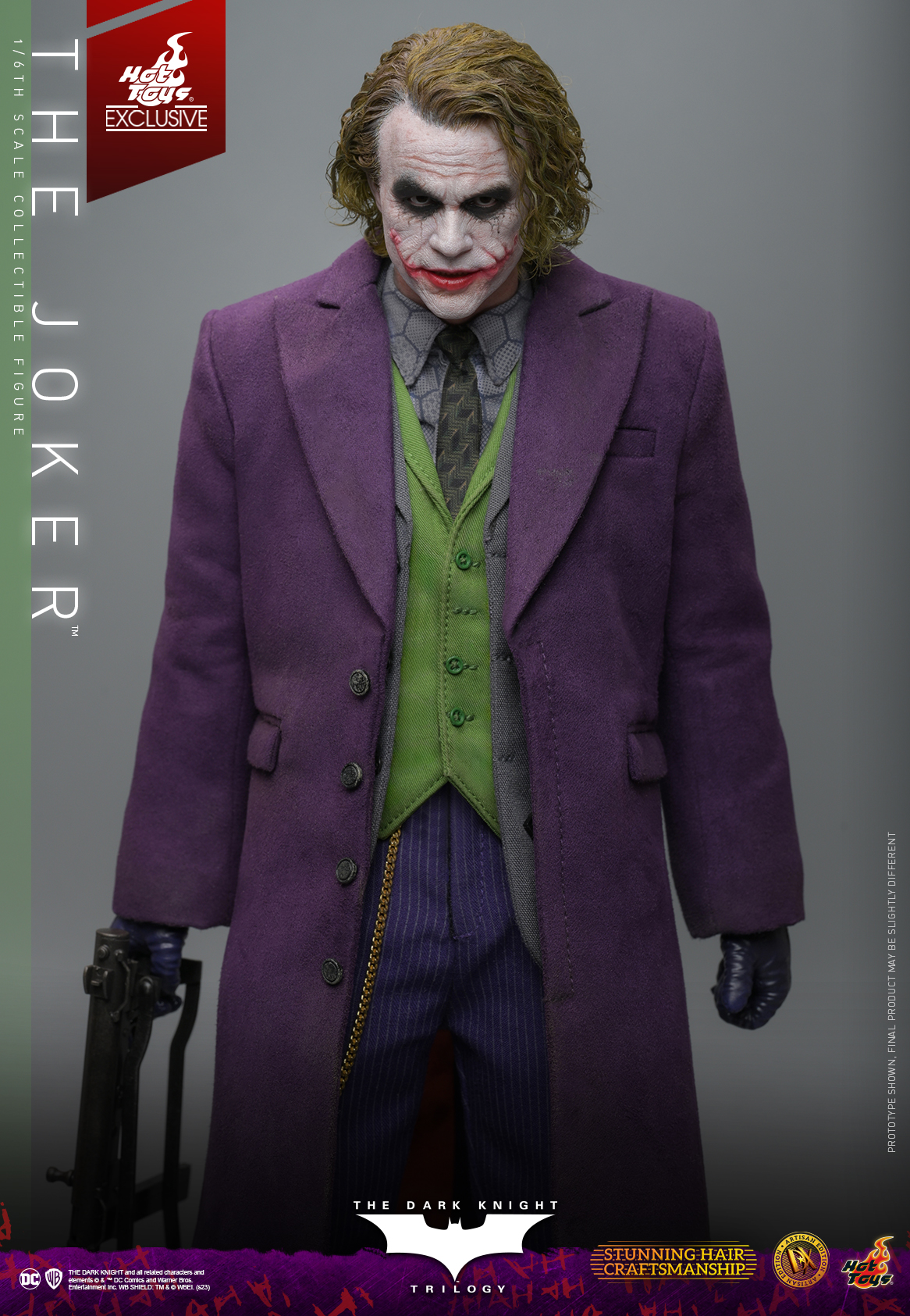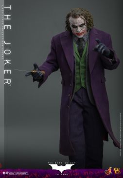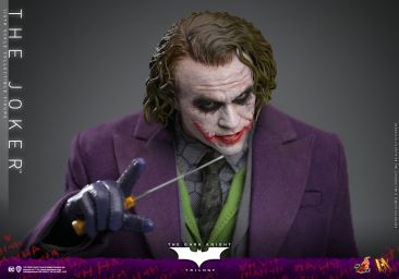 This time we have worked closely with Derek Kwok (Hong Kong Film Director), a Christopher Nolan fanatic himself, who spent over a decade to refine his passionate The Dark Knight Joker’s costume in 1/6th scale, as a hobby. Hot Toys is honored to create a custom-tailored costume based on The Joker’s signature purple coat outfit in Nolan’s The Dark Knight with Director Kwok’s involvement. From the choice of material to the cuts and layer arrangements, Derek showed his professionalism and expressed great passion, combining Hot Toys’ workmanship to give the real fabric costume the highest level of screen accuracy.Our brand new Joker figure is faithfully crafted based on Heath Ledger’s stunning portrayal of The Joker in The Dark Knight. Features a newly developed head sculpt with separate eyeball rolling system, and its pupil diameter only up to 4.5mm produced by numerous layers of painting. His phenomenal make-up accented by the red grin, and two styles of mouth piece including a gesturing tongue for different expressions.