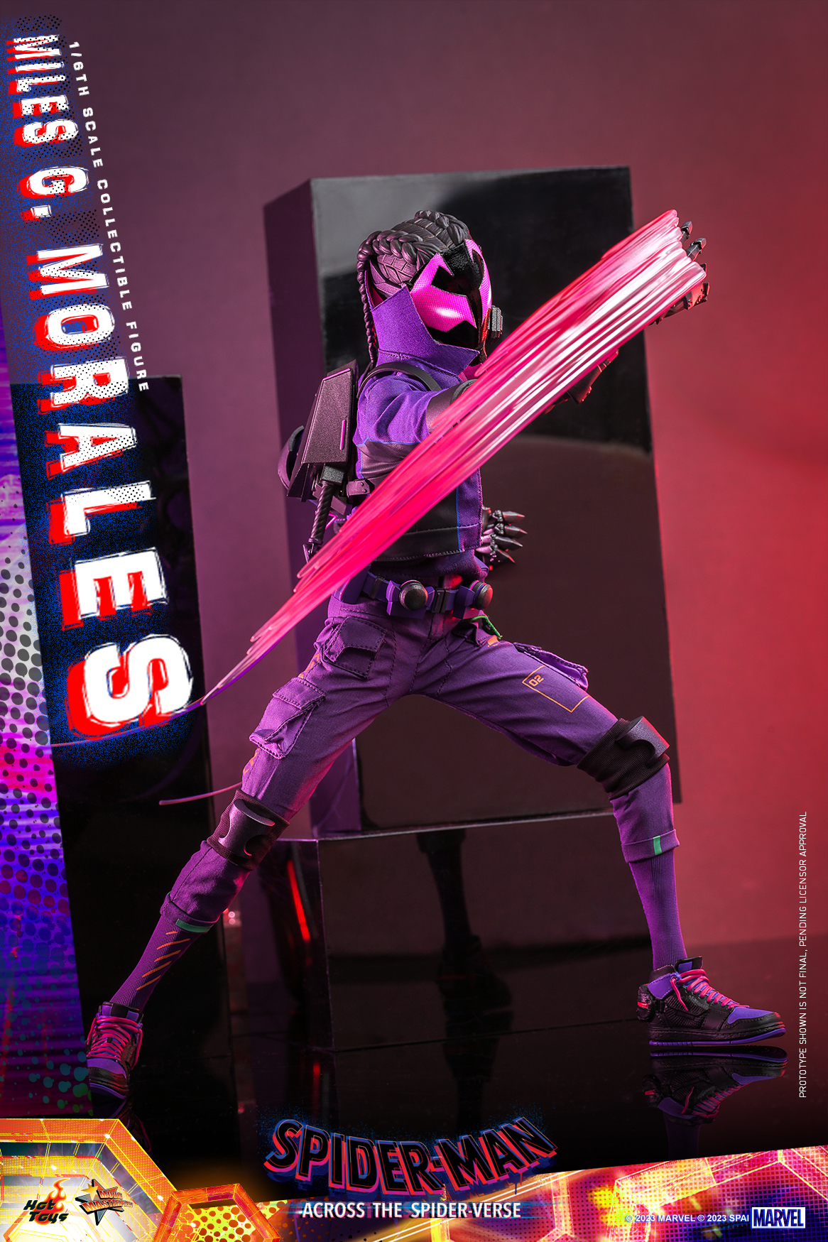 The highly-detailed figure includes a newly developed head sculpt with separate rolling eyeball system and a masked head with LED light up function in purplish red. His futuristic outfit in purple tone is beautifully recreated through a mixed media costume, from the jacket with tall standing collar, backpack, printed shirt, pants and the sculpted utility belt. The figure also includes a pair of LED lighted Prowler gauntlets and sneakers with luminous reflective effect to complete his look as seen in movie. More detailed accessories include spray cans, attacking effect, comic art backdrop, a pipe pole with chains as diorama accessory, and a themed figure stand.