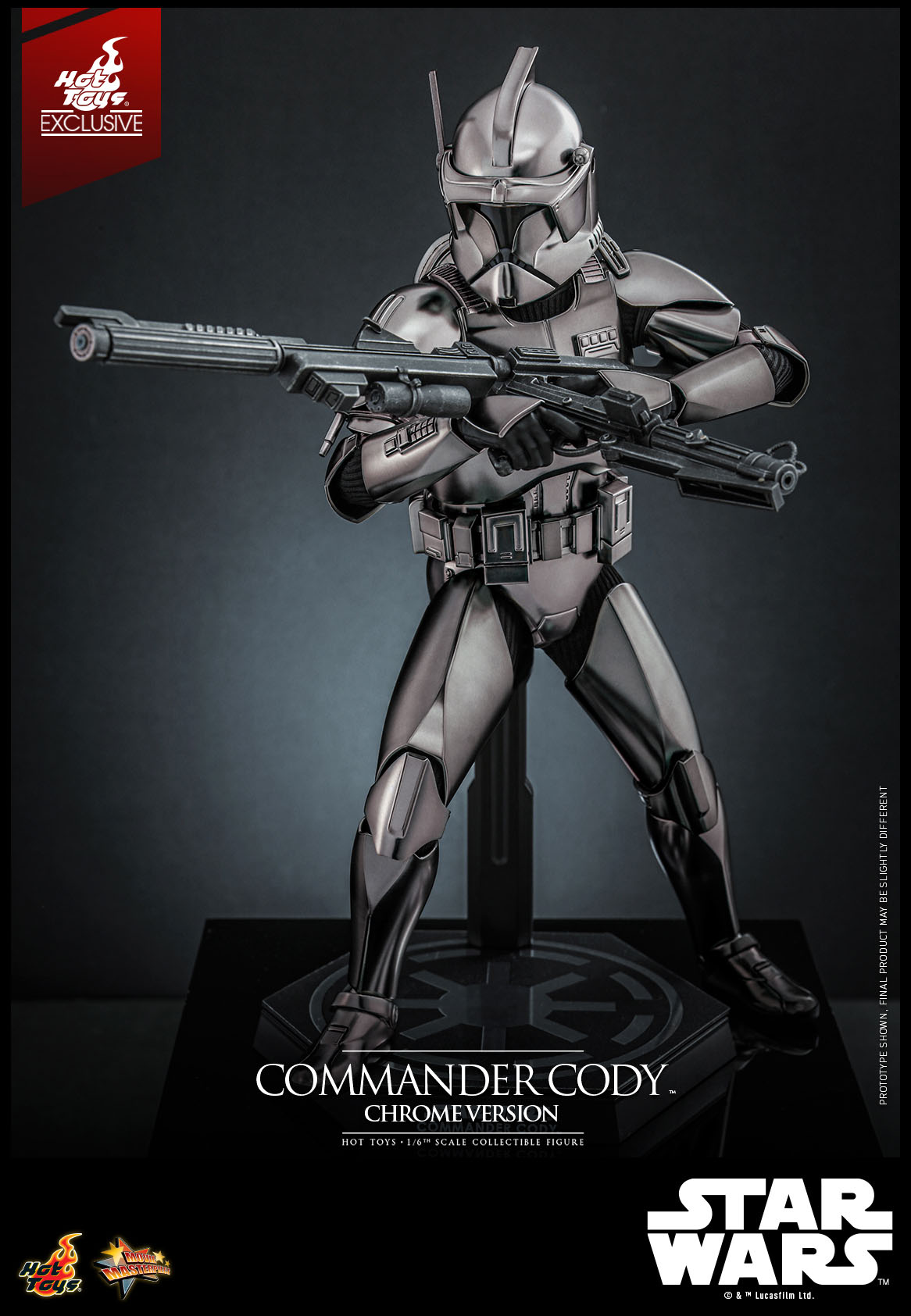 The Clone Commander Cody 1/6 Scale Figure (Chrome Version) stands at 11.8″ tall, with about 30 points of articulation. The figure features a metallic chrome finish, multiple interchangeable hands, two blaster rifles, two interchangeable helmets, a magnetic jetpack, and a display stand. This version of Commander Cody is listed as a Hot Toys Exclusive. The figure is set to be released between the Second and Third Quarters of the year.