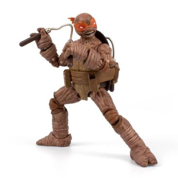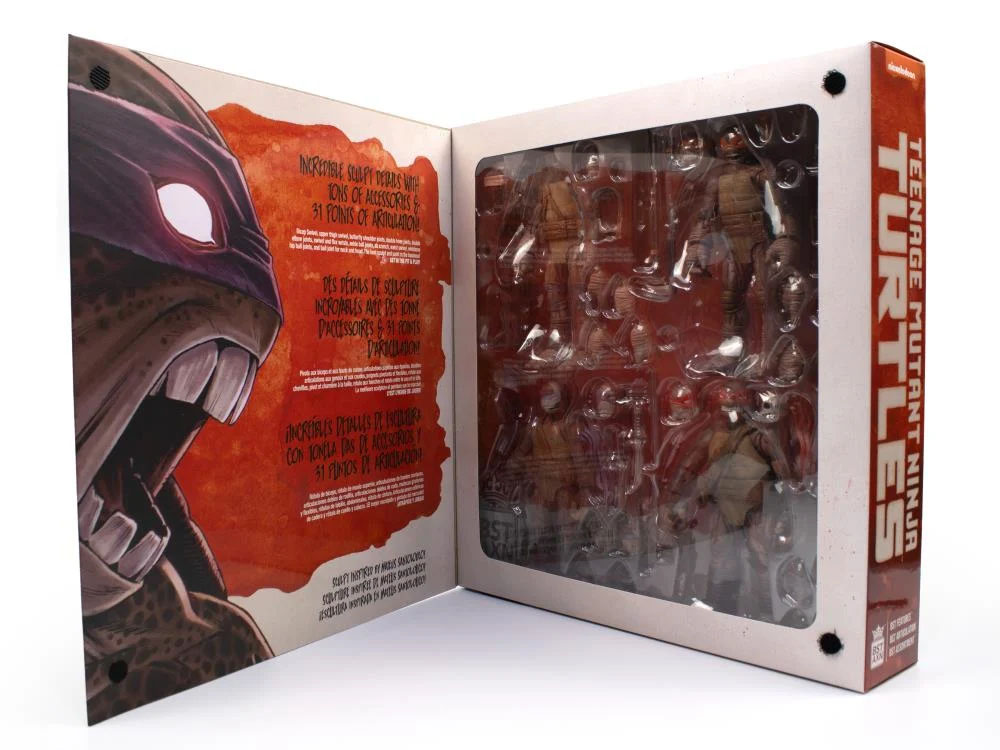 Included in this chilling collection are undead versions of Michelangelo, Leonardo, Donatello, and Raphael, each with their signature weapons, multiple interchangeable hand grips, and a bone-chilling 31 points of articulation per figure! With customized artwork by Mateus Santolouco and a garage door-style collector’s box with Velcro cinches, this set is a haunting addition to any TMNT fan’s collection.