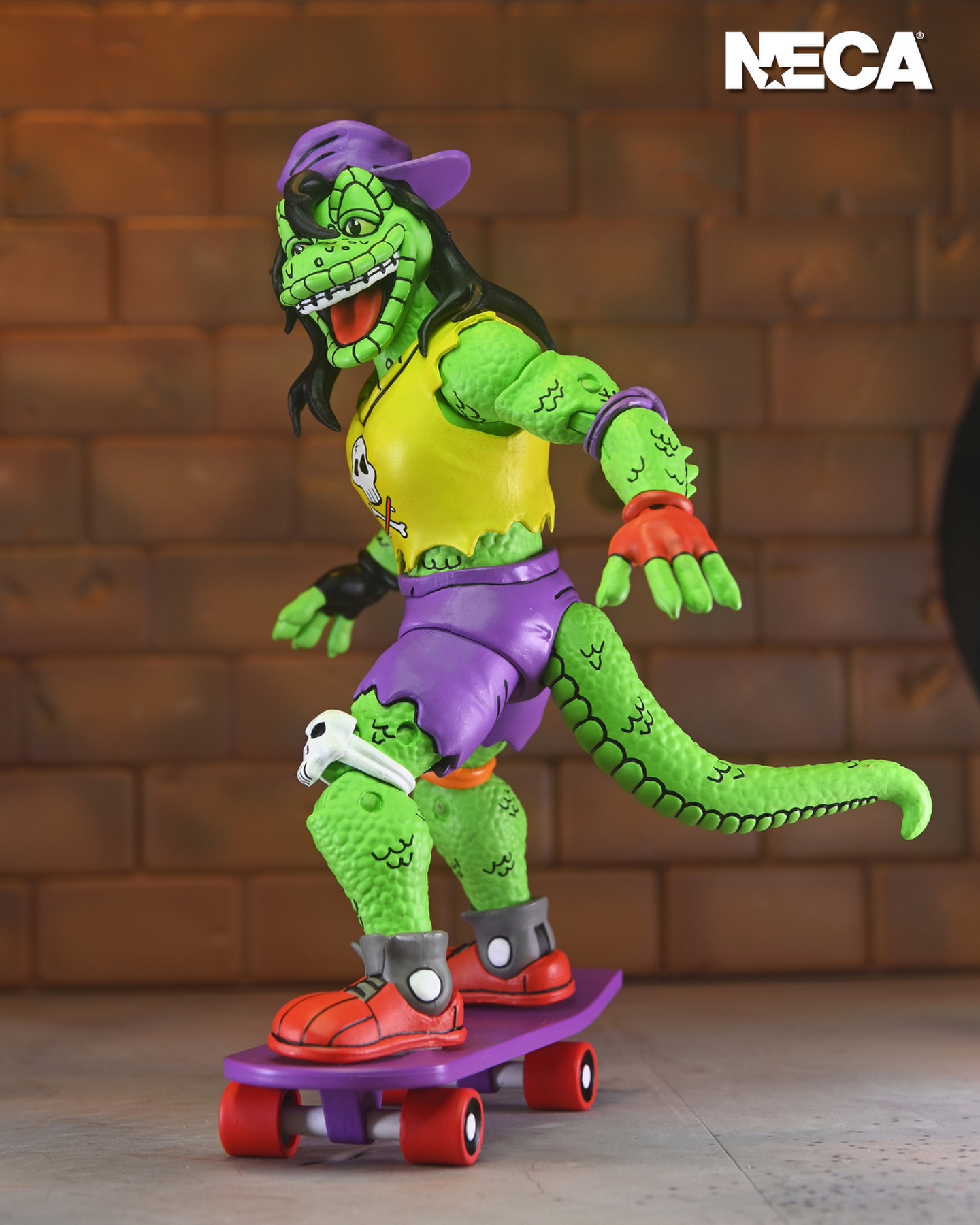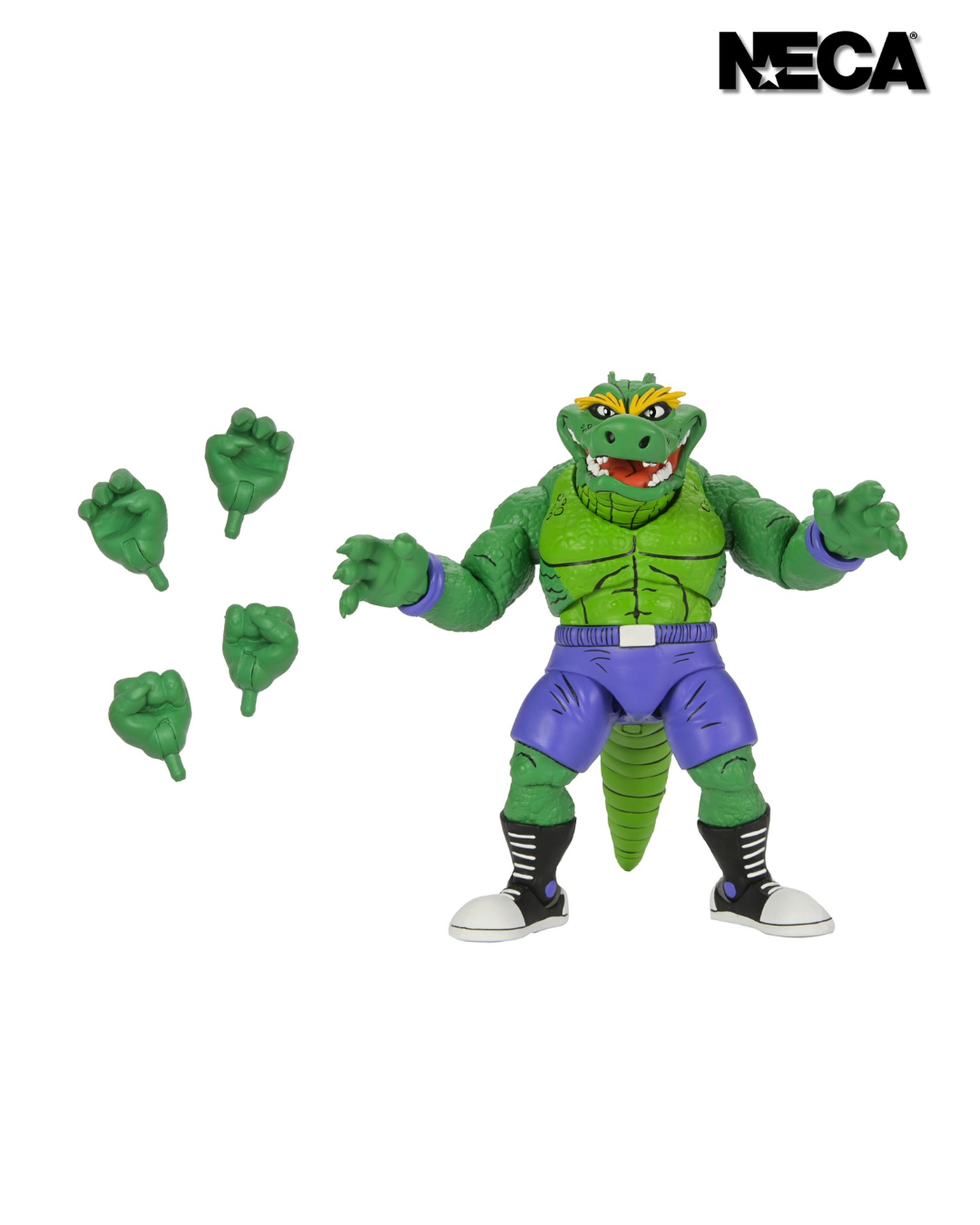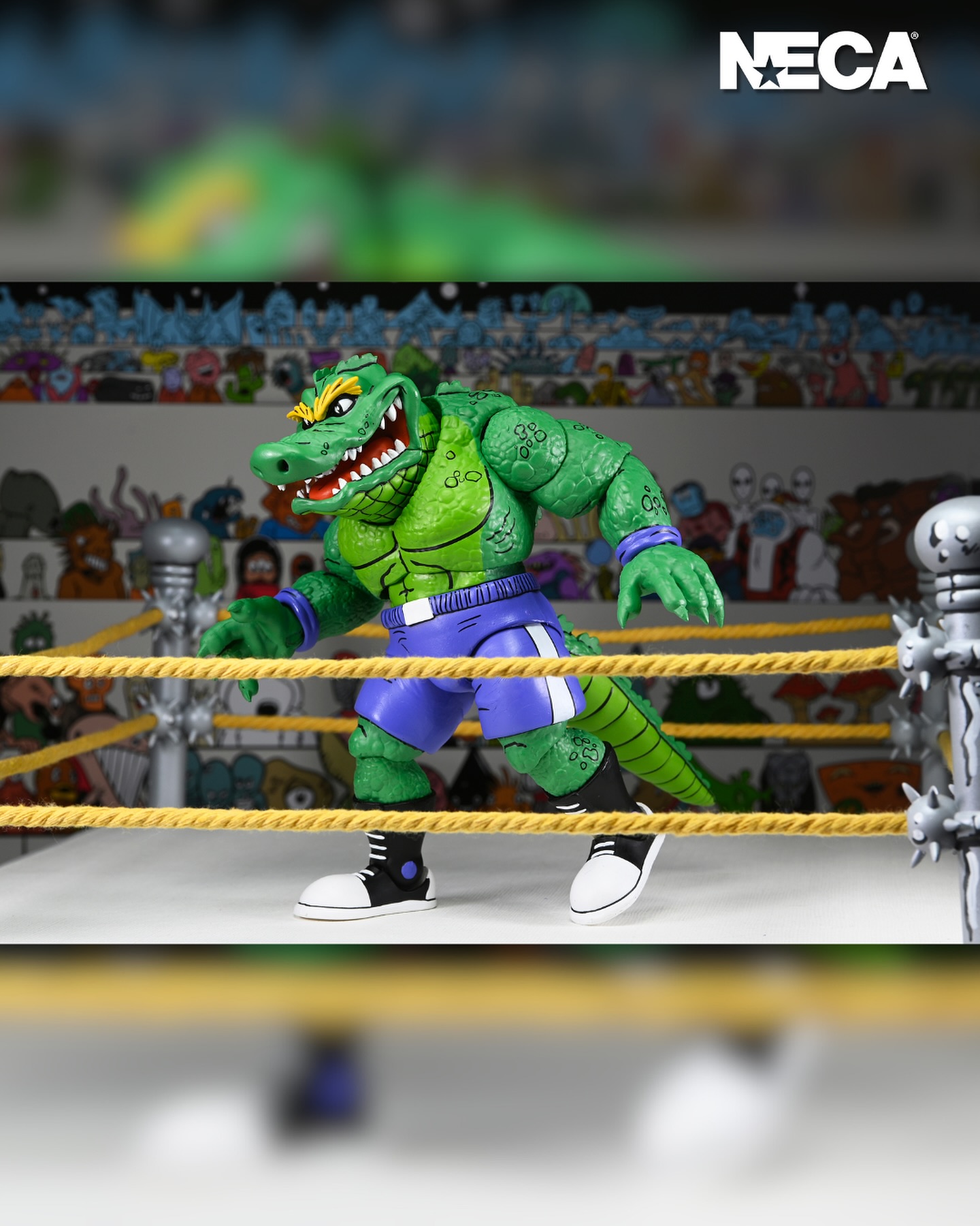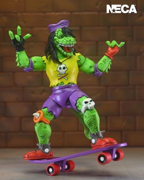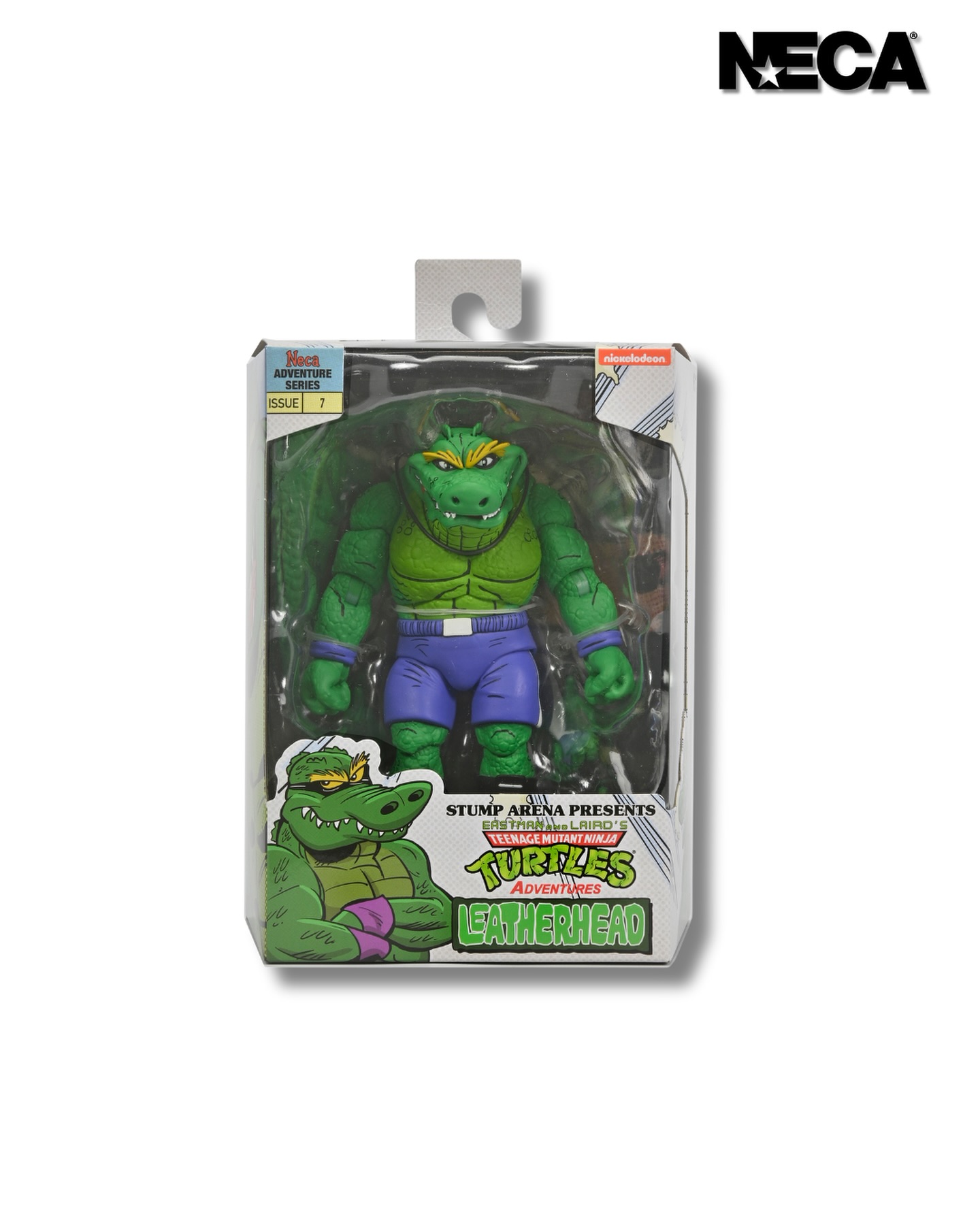 A first-time figure straight from the pages of Eastman and Laird’s Teenage Mutant Ninja Turtles Adventures comic book series from Archie Comics! This 7-inch scale Stump Wrestling Leatherhead action figure by NECA features a hinged jaw to chomp the champ and a bendy wire tail to bash turtle brains! It also includes extra hands and comes in reliable window box packaging with original box art by Ken Mitchroney.
