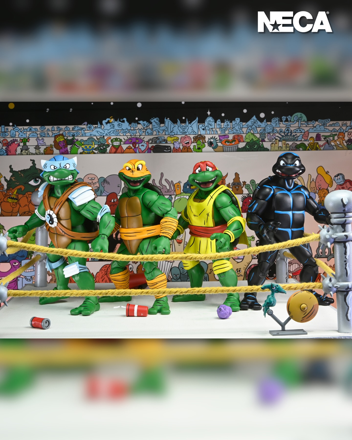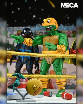 An action figure first! Straight from the pages of Eastman and Laird’s Teenage Mutant Ninja Turtles Adventures comic book series from Archie Comics, it’s the Stump Wrestling Turtles! Featuring all-new sculpts based on their iconic wrestling appearance, these 7-inch scale action figures include extra hands for all the grueling, intergalactic Greco Ro-man grappling and gut busting adventure! This NECA action figure 4-pack comes with all the wrestling staples: folding chair, sledgehammer, fire extinguisher, ice cream cone, and soda can. Plus, ringside bell and space pterodactyl! The package insert can also double as a backdrop for your display and photography needs… talk about collector-friendly! Comes in packaging with very special box art by original TMNT Adventures artists Ken Mitchroney and Gary Fields!