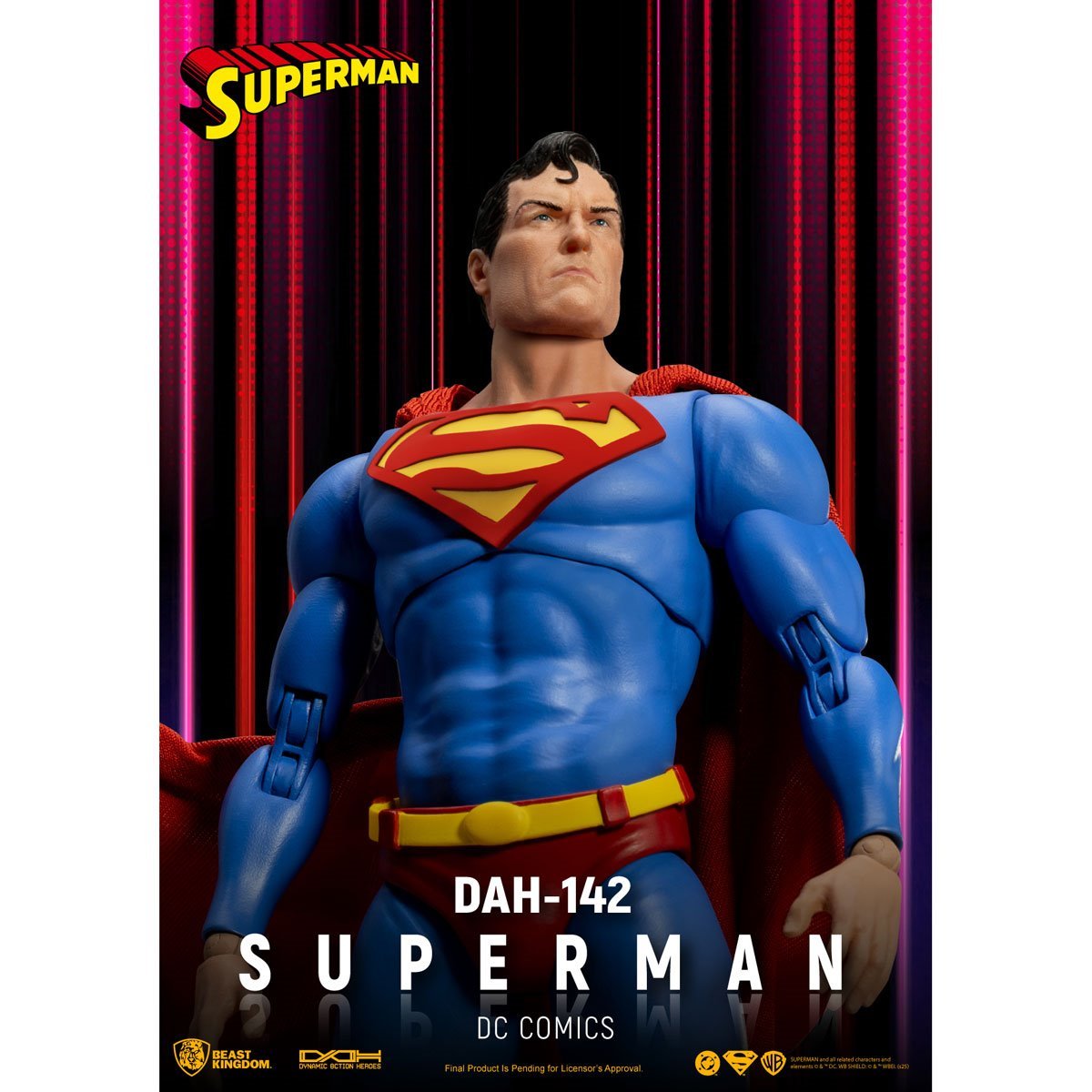 Beast Kingdom presents the DC Comics Superman DAH-142 Dynamic 8-Ction Heroes Action Figure! The last son of Krypton, Clark Kent, also known as Superman, is the ultimate symbol of justice and hope in the DC Universe. Gifted with superhuman strength, flight, heat vision, and heightened senses, he is Earth’s mightiest protector. The DAH-142 figure showcases Superman’s iconic look with a meticulously sculpted head, signature determined gaze, and classic blue suit with red and yellow accents. The famous S-shield on his chest and fabric red cape with inner wire frame complete his heroic presence. Features 22 points of articulation and 4x interchangeable hands (fists, open hands, item-holding, relaxed), allowing you to recreate classic flight and battle poses. A must-have piece for Superman collectors. This figure measures approximately 8-inches tall.