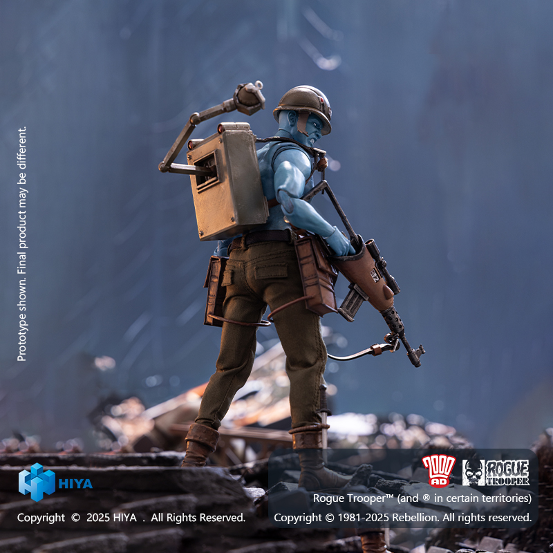 From the 2000 AD Rogue Trooper comic series comes a new Rogue Trooper 1/12 Scale Figure from Hiya Toys. The blue-skinned warrior stands at 6.5″ tall. It includes two interchangeable portraits, multiple interchangeable hands, a removable helmet, an assortments of weapons, a backpack, and a display stand. The figure will be priced at $105.99 (US Tariff included), with a release scheduled for the Fourth Quarter of 2026.