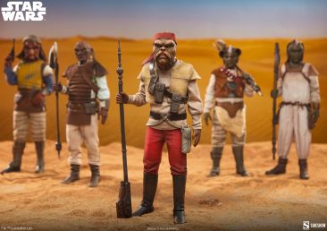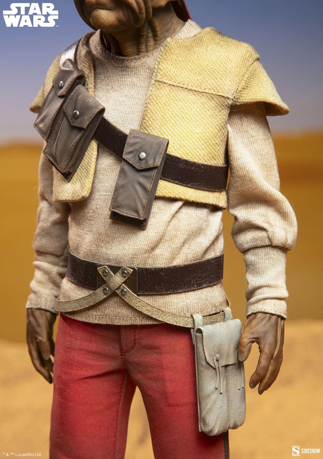 Inspired by the character’s appearance in Return of the Jedi™, this fully articulated, highly poseable high-end Star Wars figure wears tailored fabric clothing accurate to his on-screen ensemble. His outfit consists of layered tan shirts, red trousers, a red bandana, and multiple brown belts. The Kithaba™ Sixth Scale High-End Collectible Figure also comes with two relaxed hands as well as two gripping hands for the vibro-axe accessory.