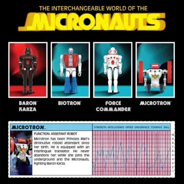 Homeworld, the molecular center of the Microverse, is under attack! Baron Karza, a ruthless ruler who villainizes the planet, has slaughtered the royal family, but Princess Mari survives—along with her loyal and very handy roboid, Microtron, who also happens to be equipped with an interlingual translator. As she joins the Micronauts resistance, fighting against Karza, Microtron never leaves her side. This diminutive assistant robot is ready to continue the resistance movement in your collection as a ReAction+ Figure. Inspired by vintage O-ring toys of the ‘70s and classic Micronauts toy design, this collectible features an O-ring style waist and is highly poseable. The head, shoulders, and arms rotate; the elbows are hinged, and there’s a backpack connection on the front and back. Two flywheel accessories and a drill accessory are included as well. The blister card-back packaging also includes original Super7 artwork, inspired by the Micronauts toys and comic book series. Save the Microverse and recruit this dedicated team member to your Micronauts collection.