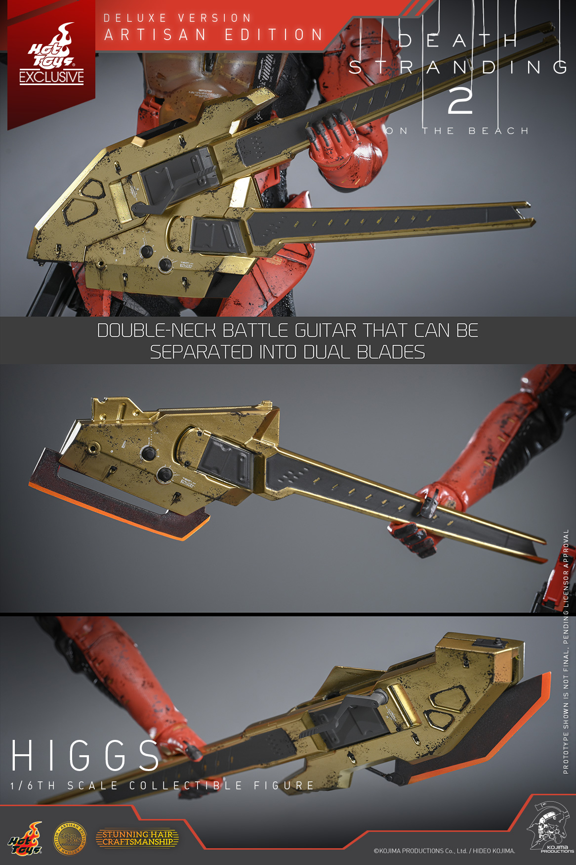 Higgs’s menacing appearance is recreated in a black suit layered beneath finely built orange armor, including arms, back, thighs, translucent chest and abdomen plating, and exoskeleton. Completing his look are a gold necklace, boots, and an Artisan Edition Deluxe Version exclusive red cloak with a magnetic fastening feature, allowing for a dynamic display. Equipped for both spectacle and destruction, Higgs wields his pistol and Battle Guitar, along with an Artisan Edition Deluxe Version exclusive gold colored double-neck Battle Guitar that can be separated into deadly dual blades. Additional accessories include a red mask, Odradek attachable to his back armor, a guitar strap, and a gut tube that connects the guitar to his waist. Collectors will also find a Dog Mine accessory and a coffin-on-tar diorama base that can be mounted on the specially designed figure stand, both exclusive to the Deluxe Version and Artisan Edition Deluxe Version, providing the perfect stage to recreate Higgs’s unforgettable entrance.