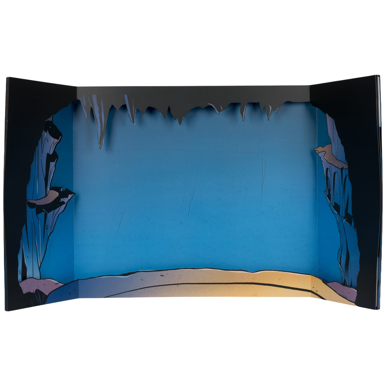 - Includes Batman’s chair, a table, scanner and cave diorama backdrop.