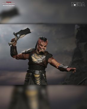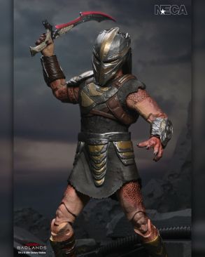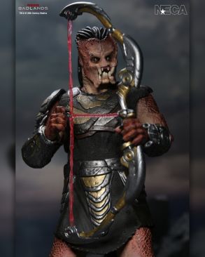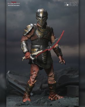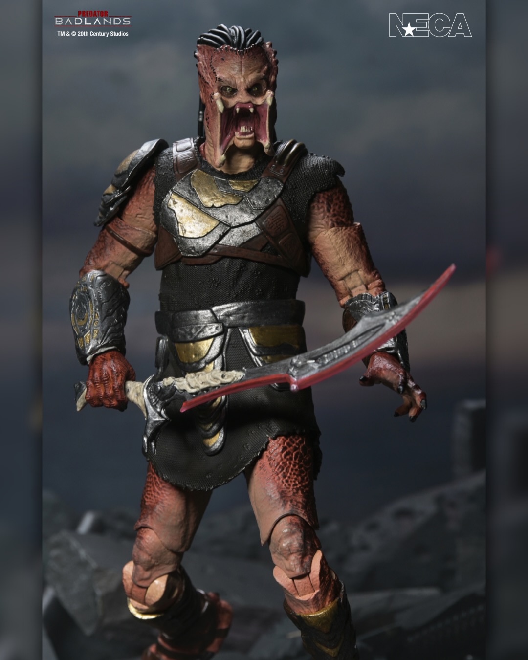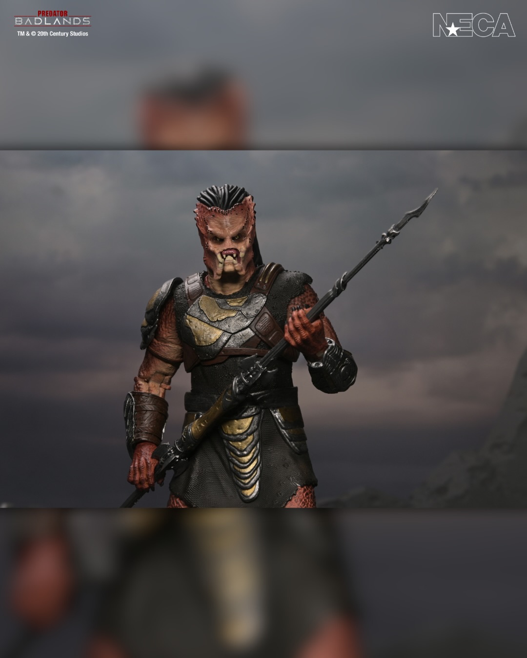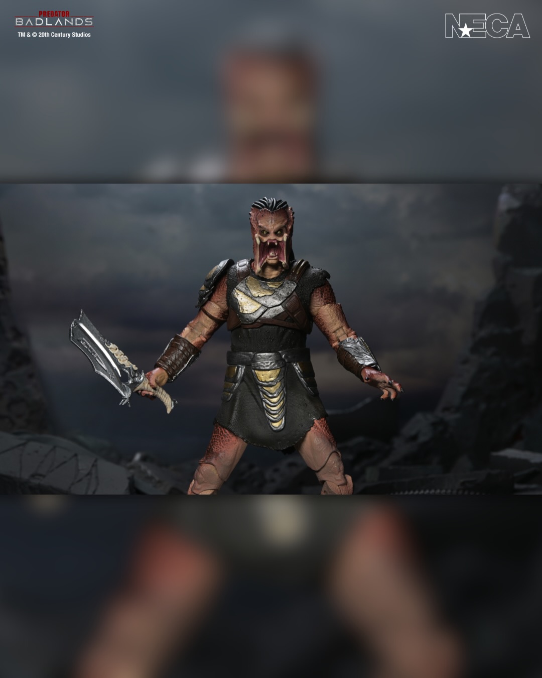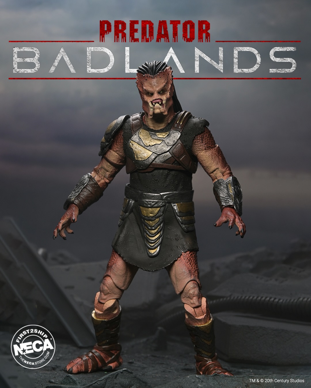 From the 2025 film Predator: Badlands by director Dan Trachtenberg! Set in the future on a remote planet called Genna, the “death planet,” a young Predator, Dek, outcast from his clan, finds an unlikely ally and embarks on a treacherous journey in search of the ultimate adversary. NECA presents Dek in his training armor in 7-inch scale Ultimate action figure form. This fully articulated figure includes interchangeable faceplates and hands, extended combistick, gauntlet blades, collapsed and extended Yautja swords, and extended Yautja compound bow. Comes in collector-friendly window box packaging with opening front flap.