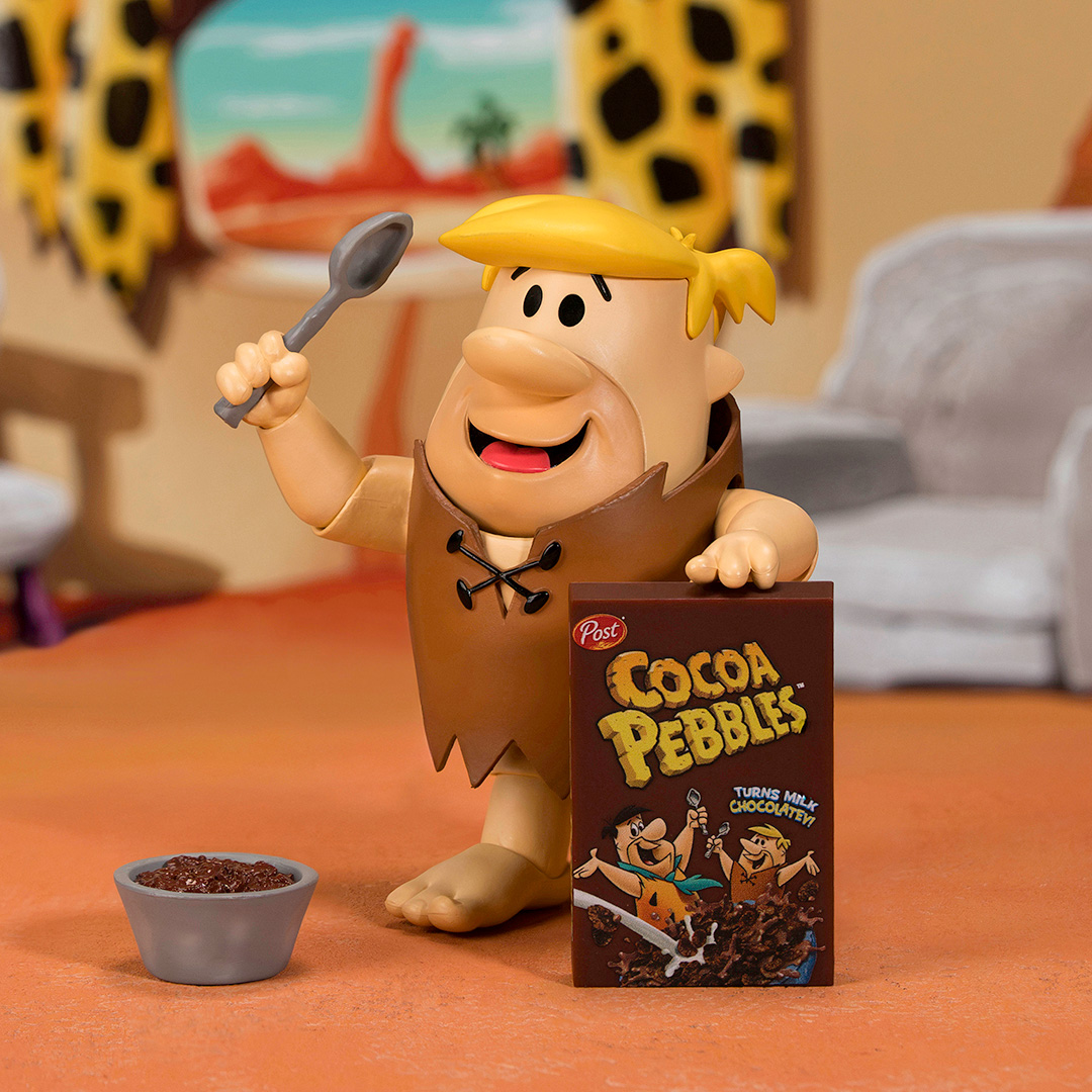 The set includes an alternate head sculpt, interchangeable hands, a Cocoa Pebbles cereal box, and a bowl of Cocoa Pebbles cereal with spoon, everything you need to recreate your favorite morning moments from Bedrock. Packaged in collector-friendly window packaging designed to resemble a Cocoa Pebbles cereal box, this figure is the perfect mix of fun, flavor, and nostalgia.