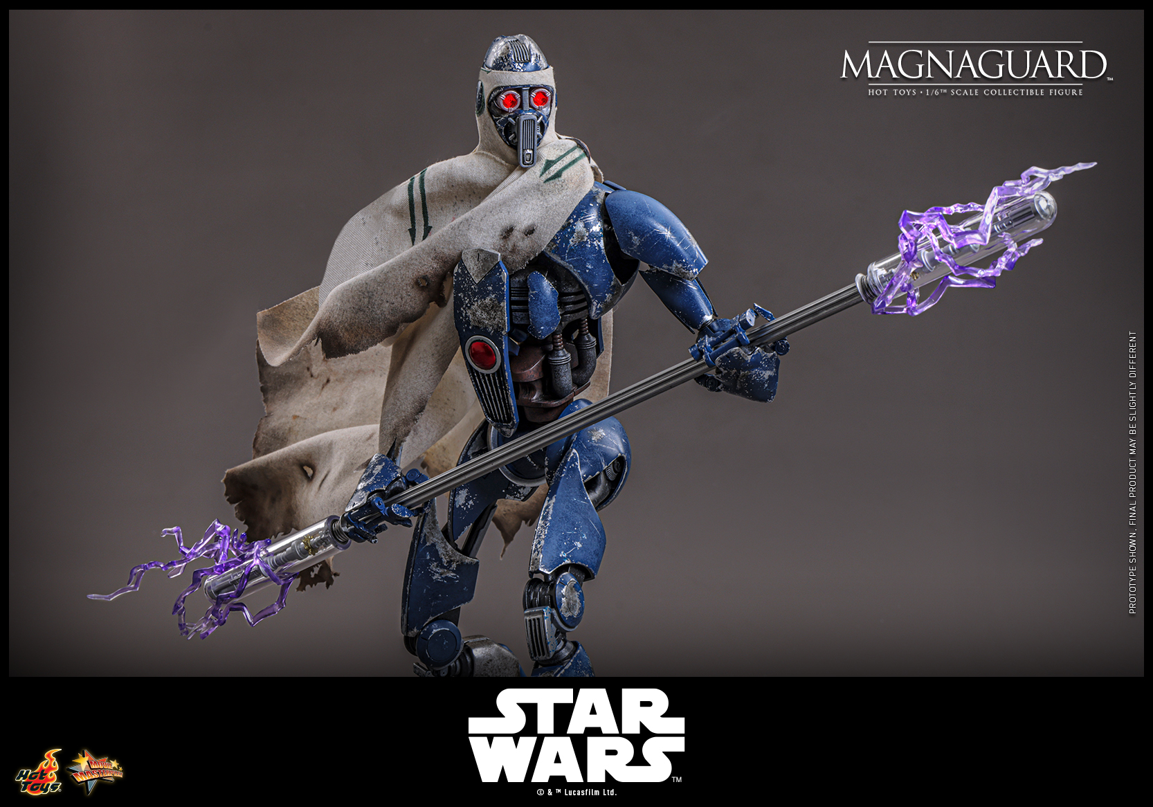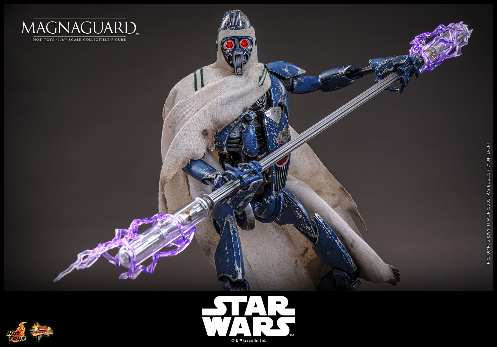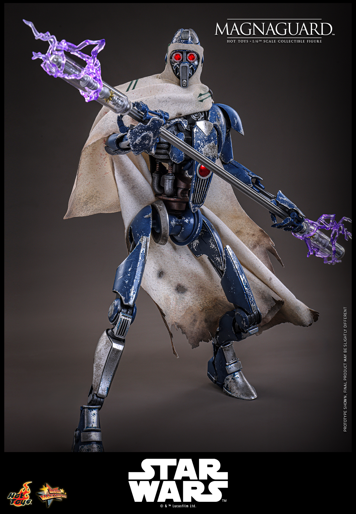 The MagnaGuard comes outfitted in a beige cloak with green stripes, battle-damaged details, and realistic weathering effects, faithfully capturing its frontline combat appearance. Equipped with its signature electrostaff, collectors can also attach the translucent purple lightning effect accessory to recreate its charged, deadly strikes. To complete the display, a specially designed figure stand with the Star Wars logo and character nameplate is included.