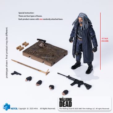 This EXQUISITE MINI Series Ezekiel action figure stands about 10.5CM tall, faithfully recreating his appearance from the TV series. Features a detailed head sculpt with his signature dreadlocks and determined look, comes dressed in a dark trench coat, tactical vest, and combat pants—capturing his mix of authority and readiness for battle.