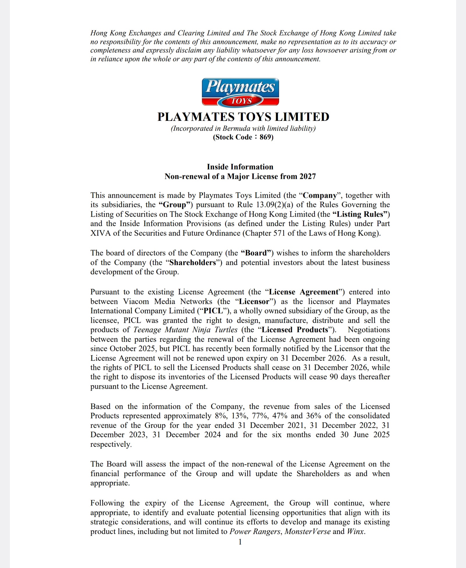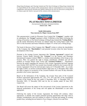 Pursuant to the existing License Agreement (the “License Agreement”) entered into between Viacom Media Networks (the “Licensor”) as the licensor and Playmates International Company Limited (“PICL”), a wholly owned subsidiary of the Group, as the licensee, PICL was granted the right to design, manufacture, distribute and sell the products of Teenage Mutant Ninja Turtles (the “Licensed Products”). Negotiations between the parties regarding the renewal of the License Agreement had been ongoing since October 2025, but PICL has recently been formally notified by the Licensor that the License Agreement will not be renewed upon expiry on 31 December 2026. As a result, the rights of PICL to sell the Licensed Products shall cease on 31 December 2026, while the right to dispose its inventories of the Licensed Products will cease 90 days thereafter pursuant to the License Agreement.