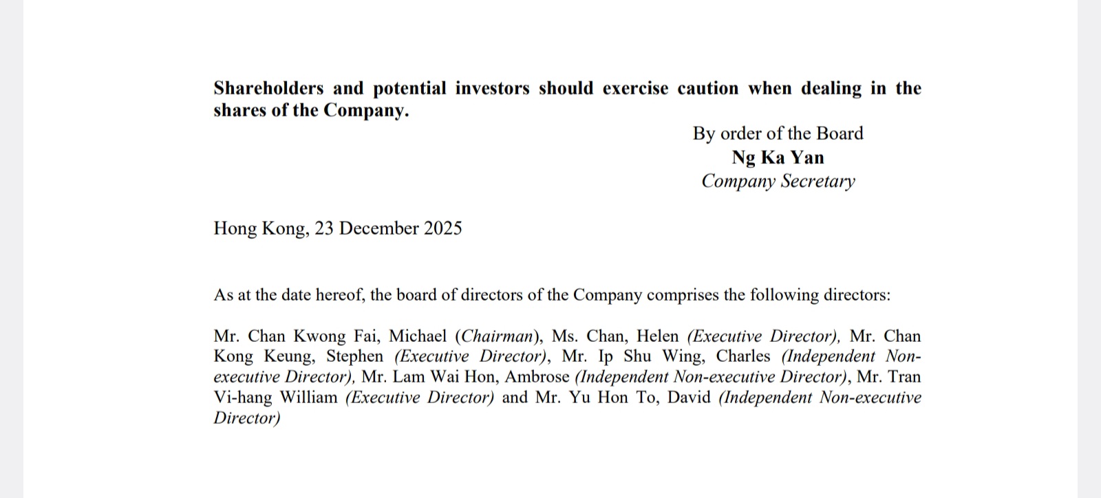 Hong Kong, 23 December 2025