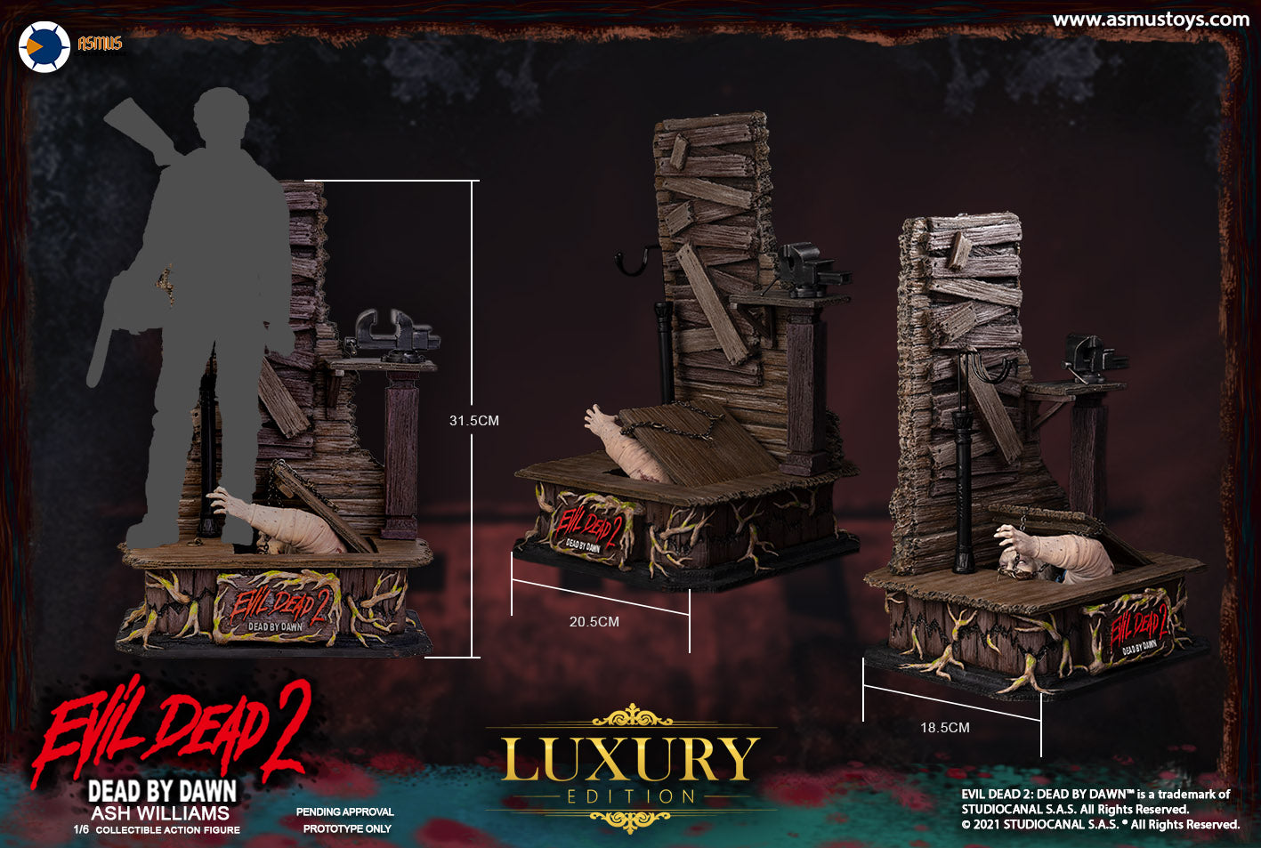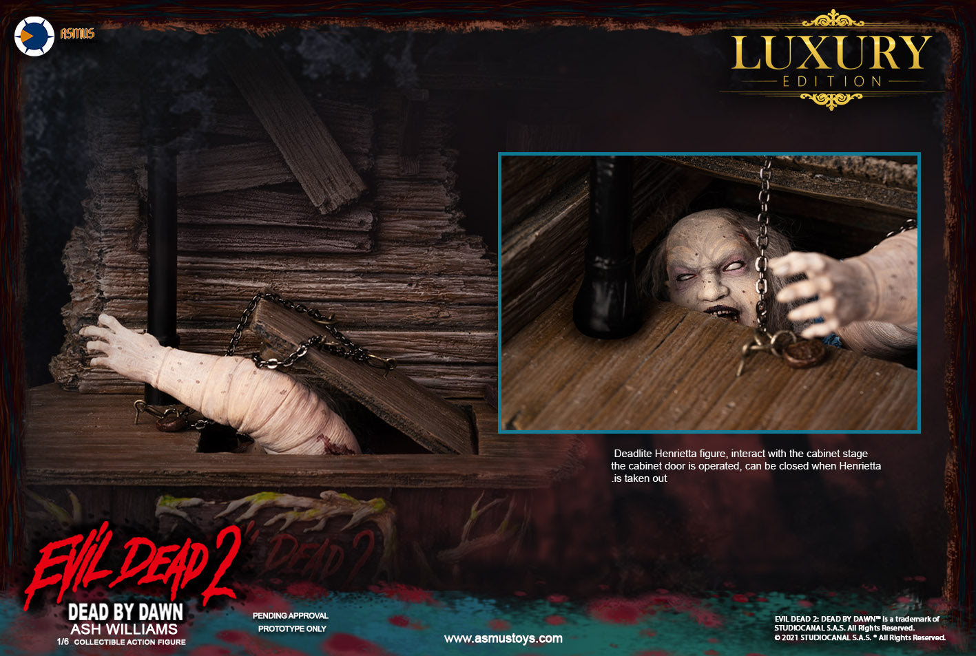Back in 2021, Asmus Toys revealed their Ash Williams 1/6 Scale Figure from the cult classic horror movie Evil Dead 2. They’ve recently announced that they will be re-releasing their Ash Williams figure, updated with new head sculpts and additional accessories. There will be two versions available, a standard release and a Luxury Edition. Ash includes two head sculpts with moveable eyes, multiple interchangeable hands, a possessed severe hand, a shotgun, a chainsaw, a Necronomicon, a Kandarian dagger, an axe, a severed deadite Henrietta head, and a display stand. The Luxury Edition adds a diorama display stand with a cellar door, and a vice grip. a deadite Henrietta bust, and a severed deadite Linda head.
