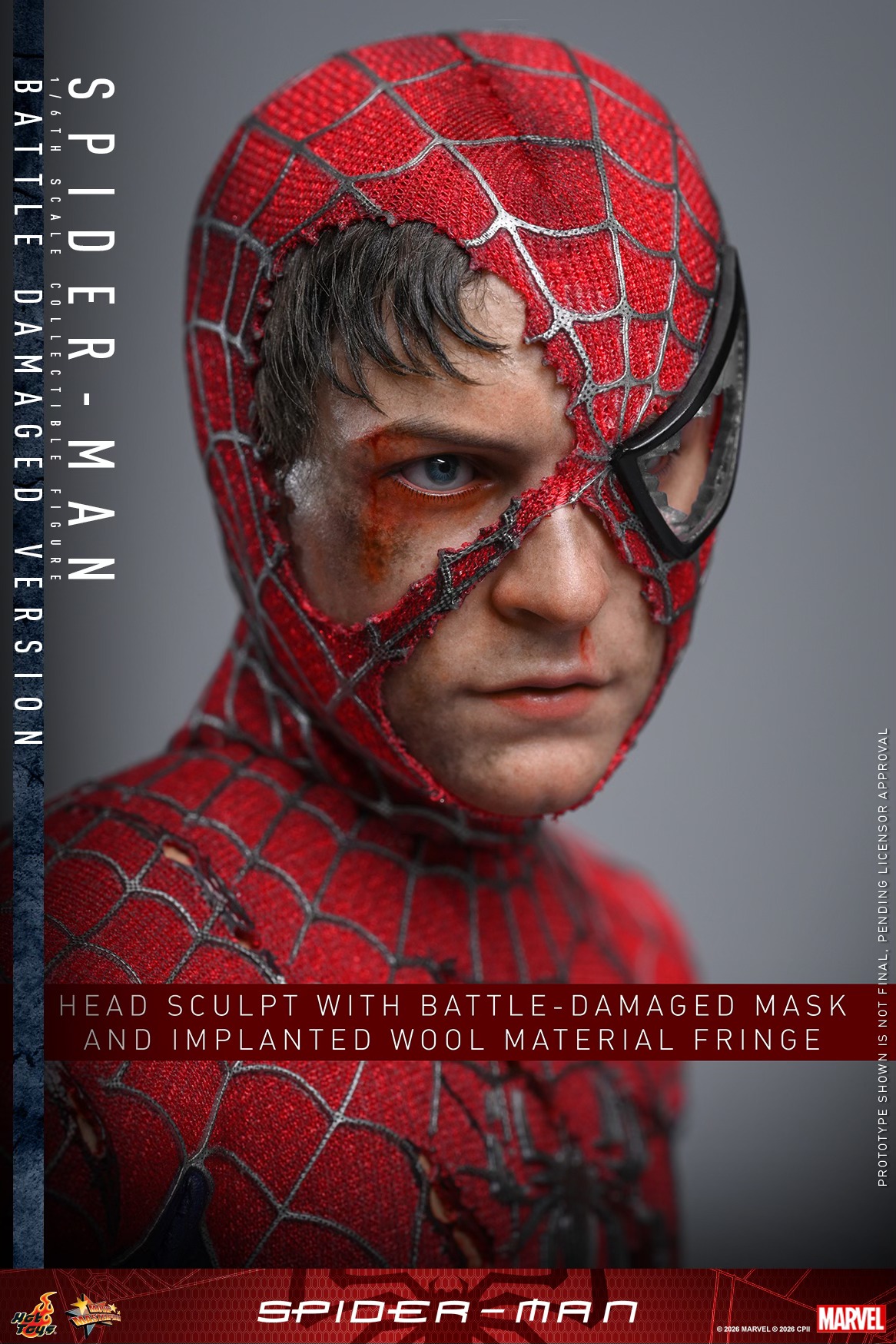 - Authentic and detailed likeness of Tobey Maguire as Spider-Man in battle-damaged state from the movie Spider-Man